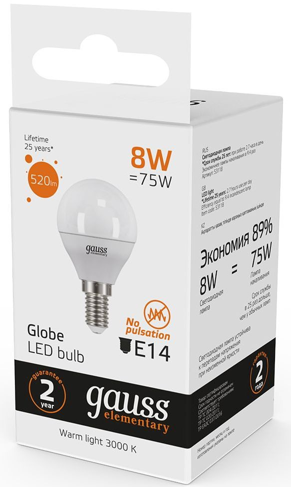 Лампа светодиодная Gauss 8Вт цок.:E14 шар 220B св.свеч.бел.теп. G45 (упак.:1шт) (53118)