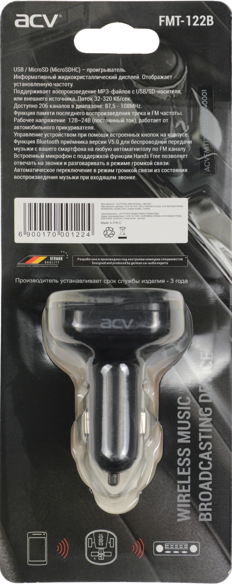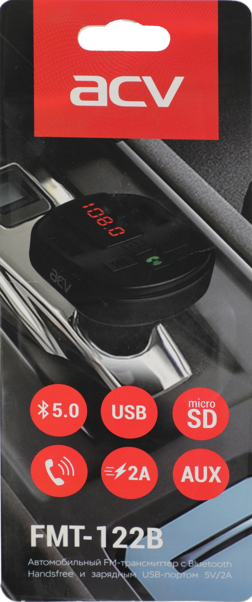 Автомобильный FM-модулятор ACV FMT-122B черный MicroSD BT USB (37576)