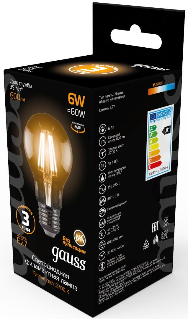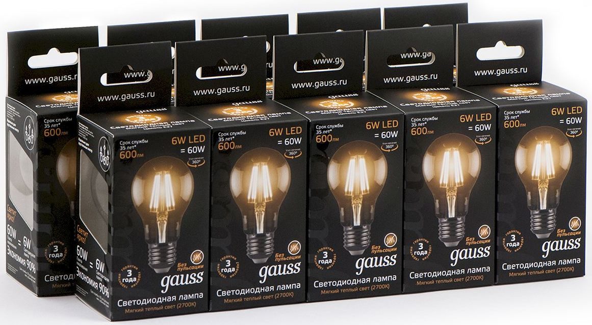 Лампа филам. Gauss 6Вт цок.:E27 шар 220B св.свеч.бел.теп. A60 (упак.:10шт) (102802106)