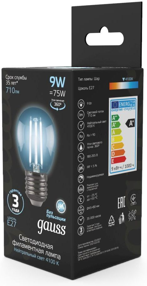 Лампа филам. Gauss 9Вт цок.:E27 шар 220B св.свеч.бел.нейт. G45 (упак.:10шт) (105802209)