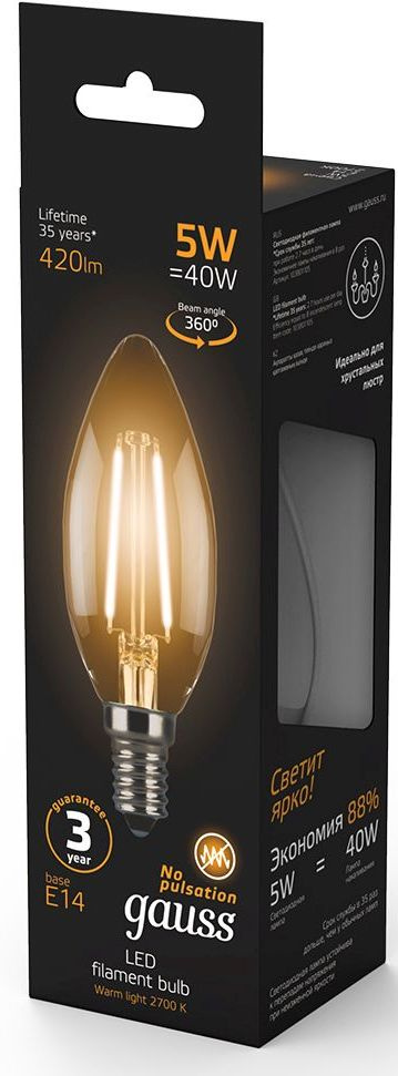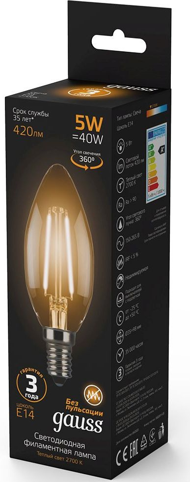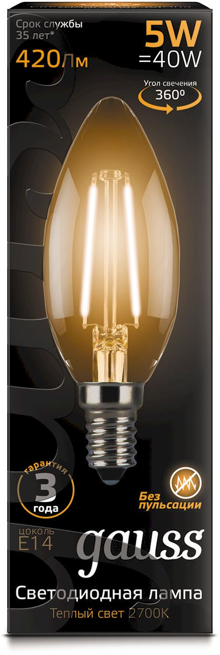 Лампа филам. Gauss 5Вт цок.:E14 свеча 220B св.свеч.бел.теп. C37 (упак.:10шт) (103801105)
