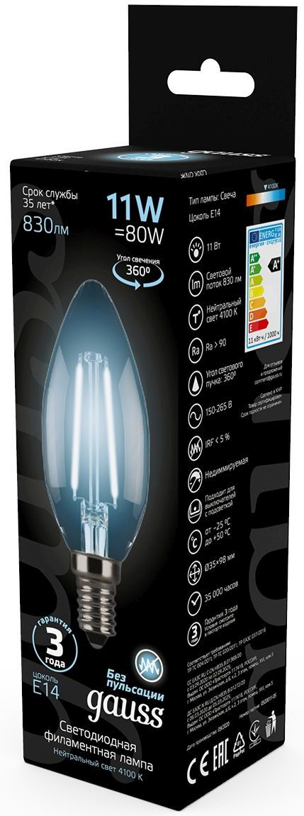 Лампа филам. Gauss 11Вт цок.:E14 свеча 220B 4100K св.свеч.бел.нейт. C37 (упак.:10шт) (103801211)