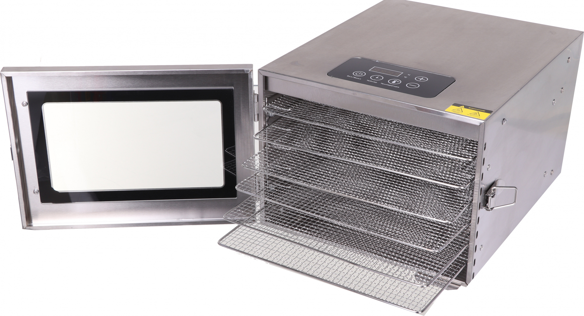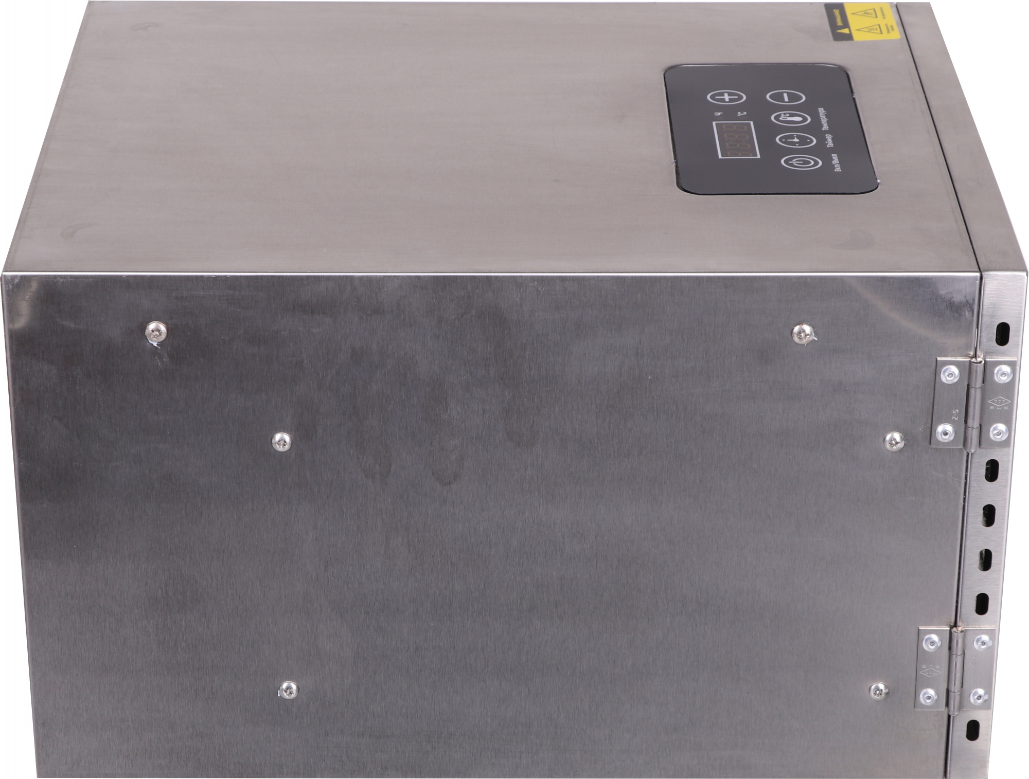 - ОсобенностиНа сушилке можно установить температуру сушки в диапазоне 30-90 °C с шагом 1 °C. Прибор также оснащён таймером до 24 часов работы с шагом 30 мин. Выбранные настройки отображаются на LED-дисплее. Их можно менять в процессе сушки, не прерывая работу.
