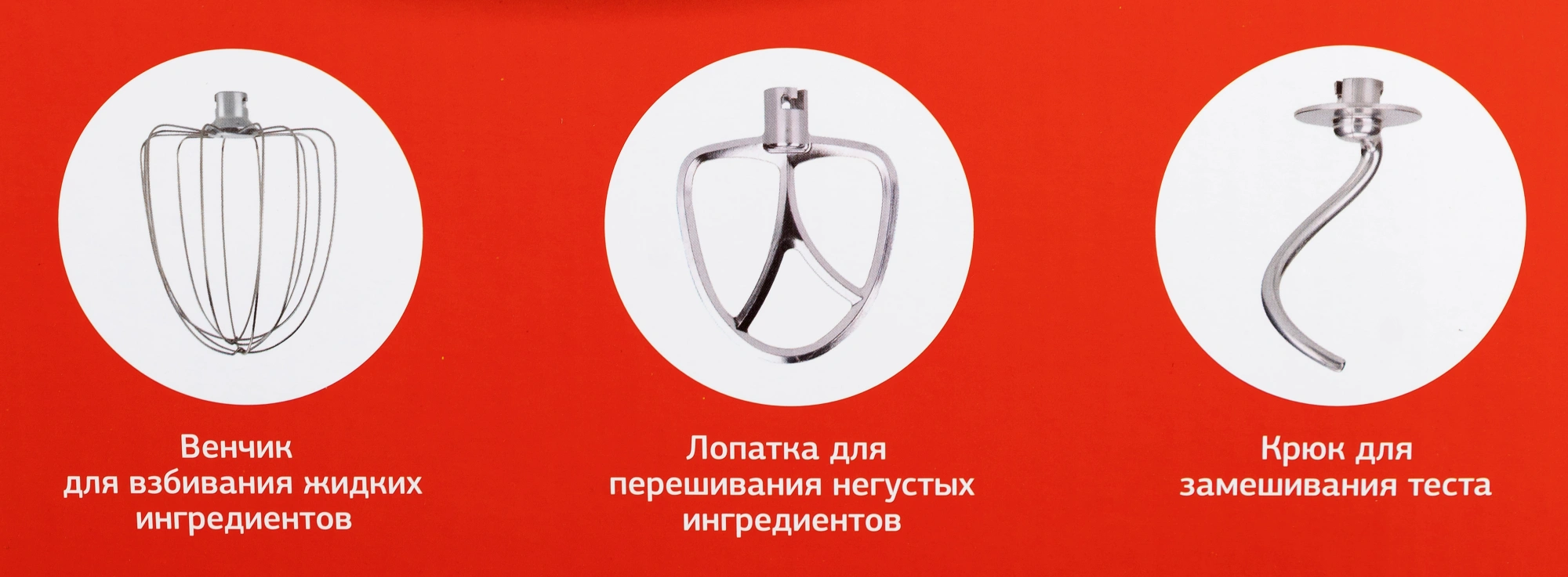 - КомплектацияМиксер; чаша; насадка-венчик; насадка-лопатка; насадка-крюк; книга рецептов; инструкция с гарантийным талоном