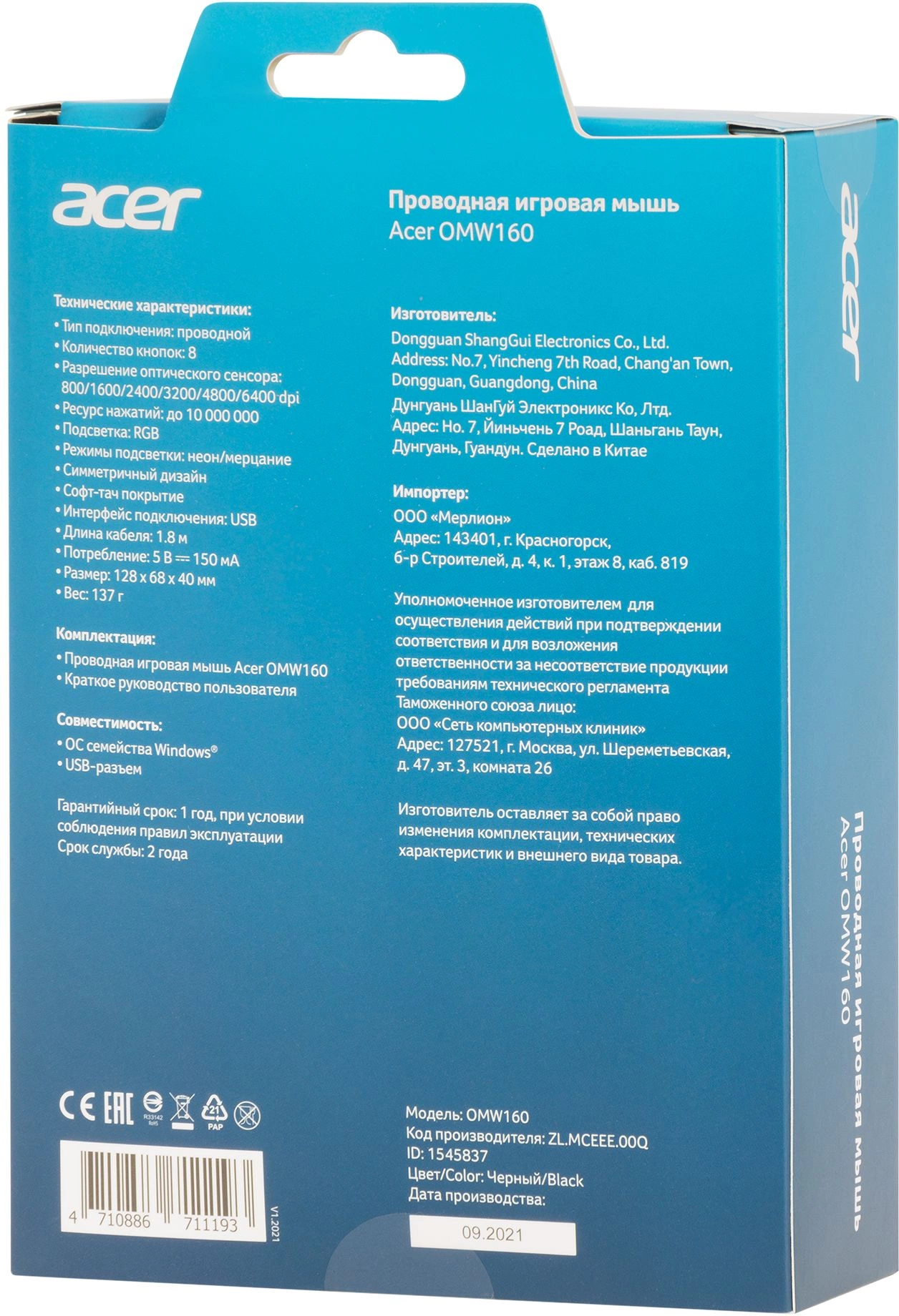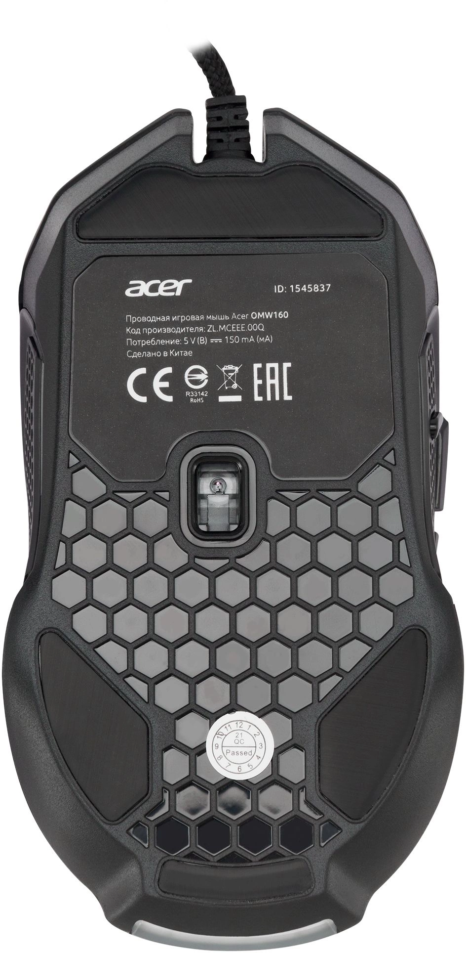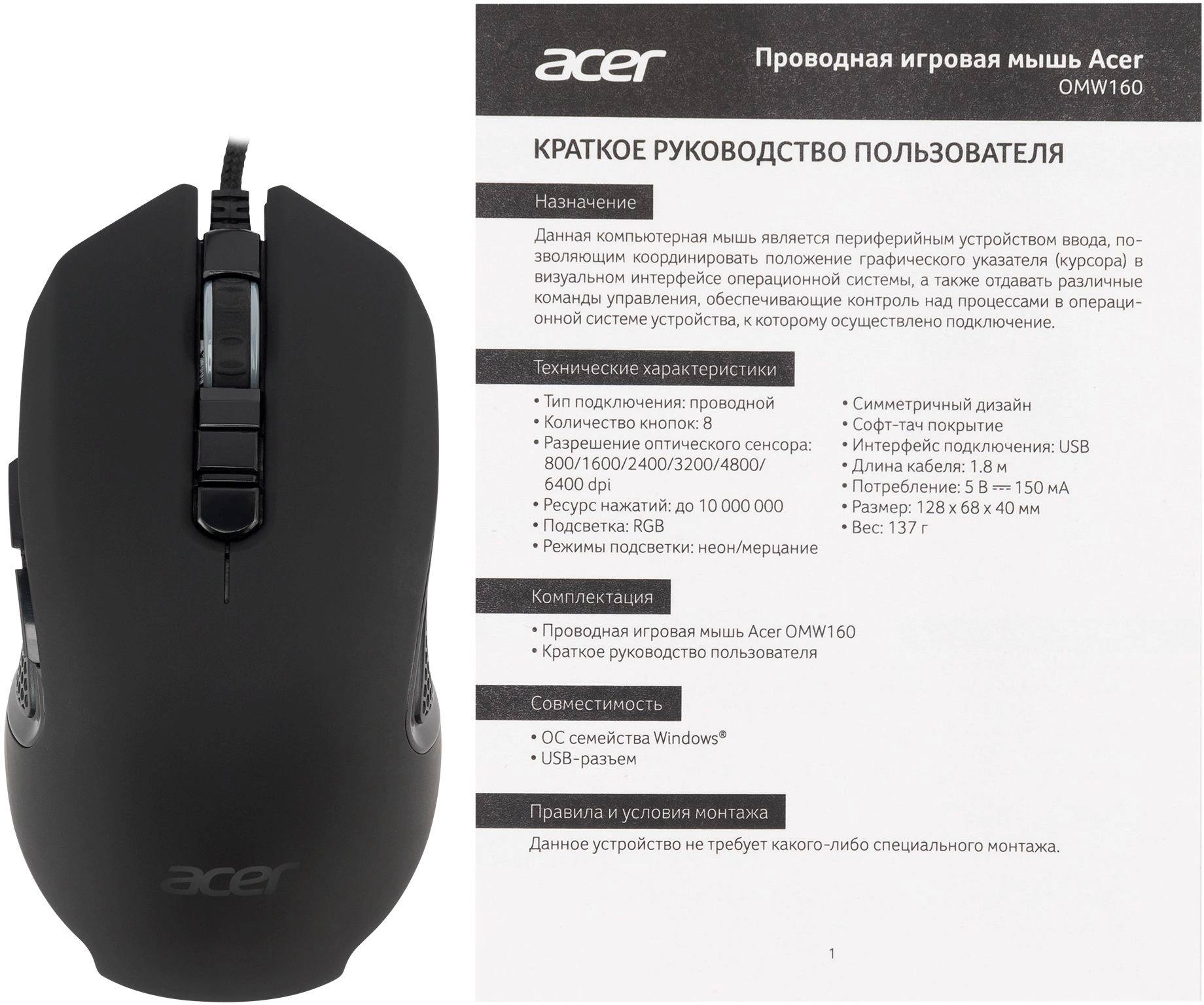 Мышь Acer OMW160 черный оптическая 6400dpi USB 8but (ZL.MCEEE.00Q)