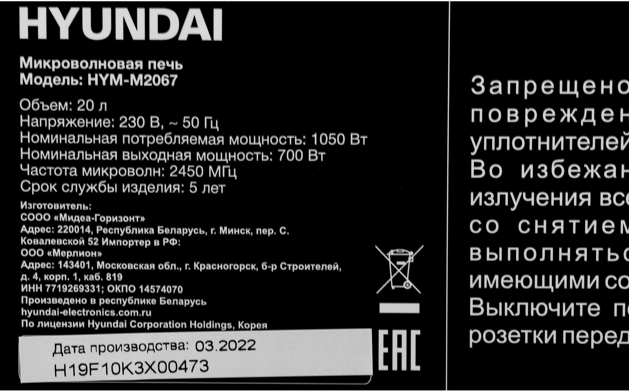 Микроволновая Печь Hyundai HYM-M2067 20л. 700Вт белый
