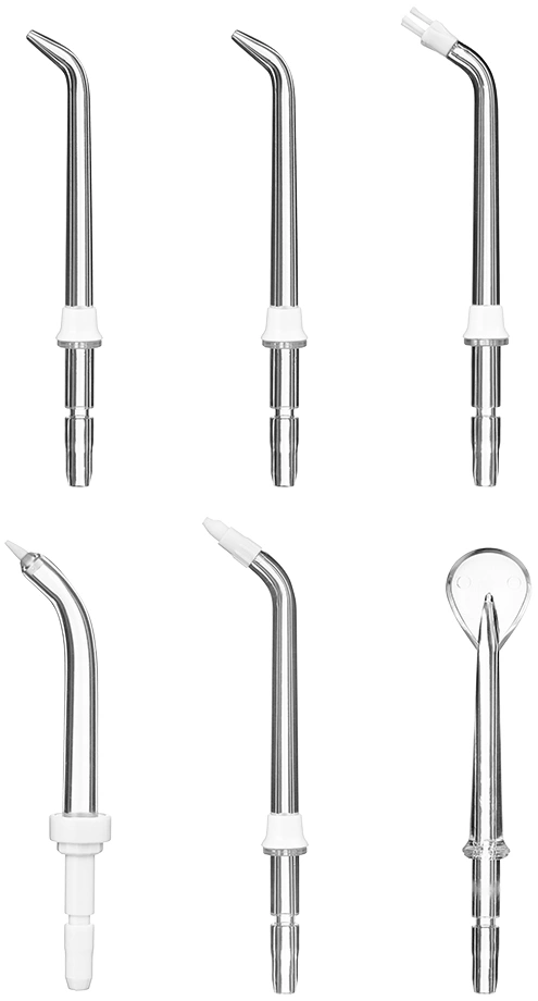 - ОсобенностиВ комплекте идут различные насадки: 2 классические струйные насадки, насадка для удаления зубного камня и налёта из-под линии десны, насадка для ортодонтических конструкций, насадка с щёточкой для удаления налёта, насадка для чистки языка.