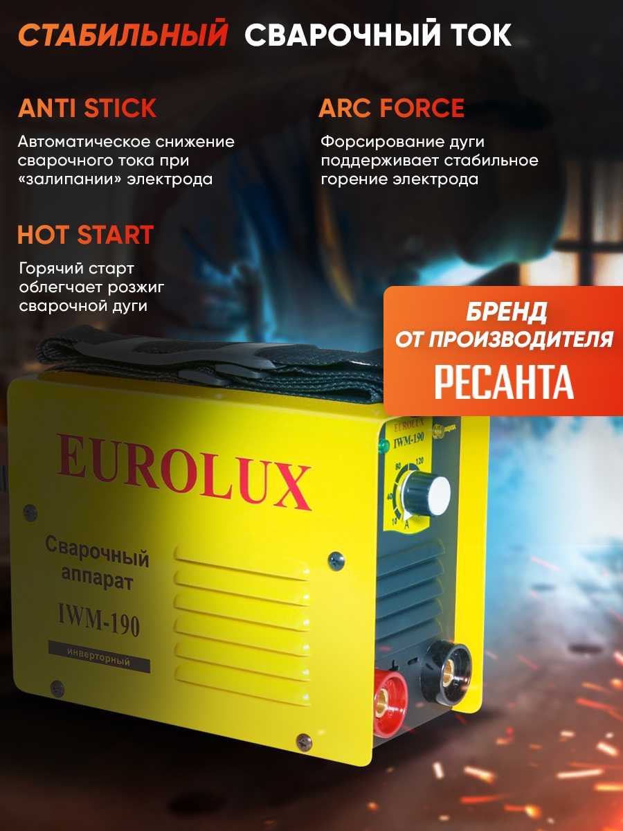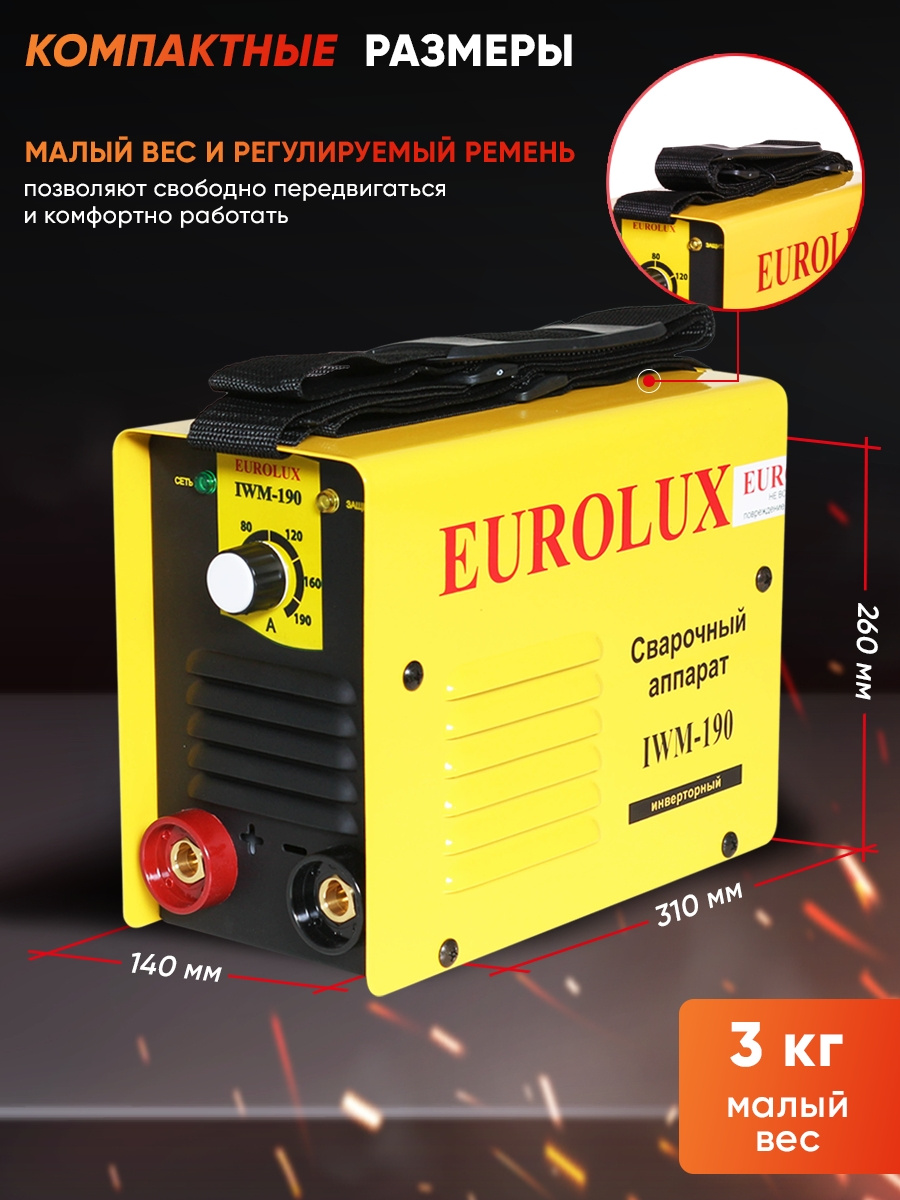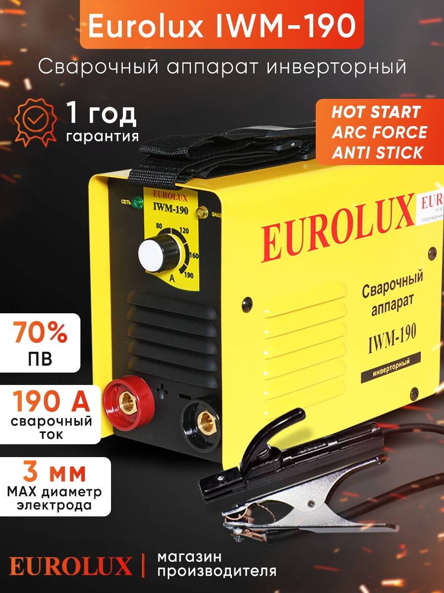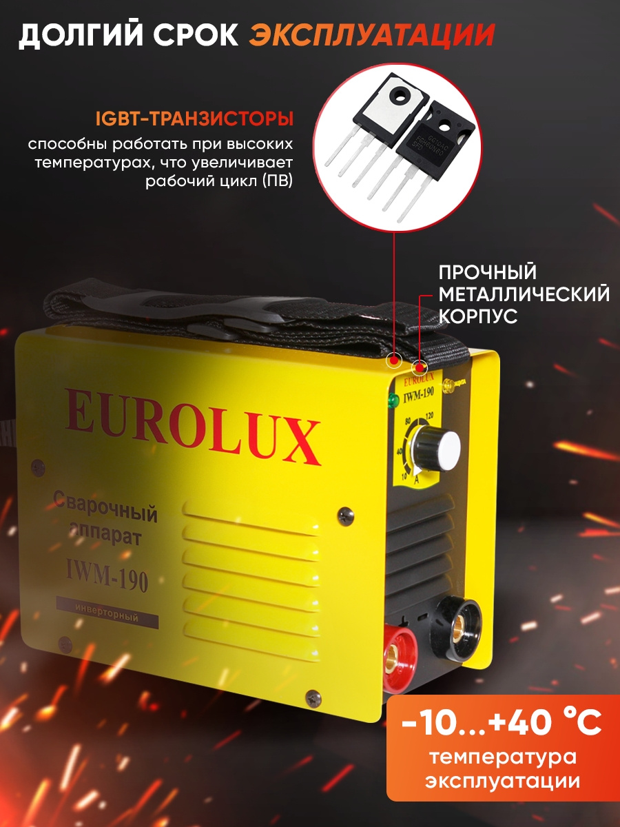 Инверторный сварочный аппарат Eurolux IWM190 предназначен для высококачественной сварки низкоуглеродистых сталей, низколегированных, нержавеющих сталей, чугуна и других металлов при проведении периодических работ в строительстве, монтажных и ремонтных работ различной степени сложности.