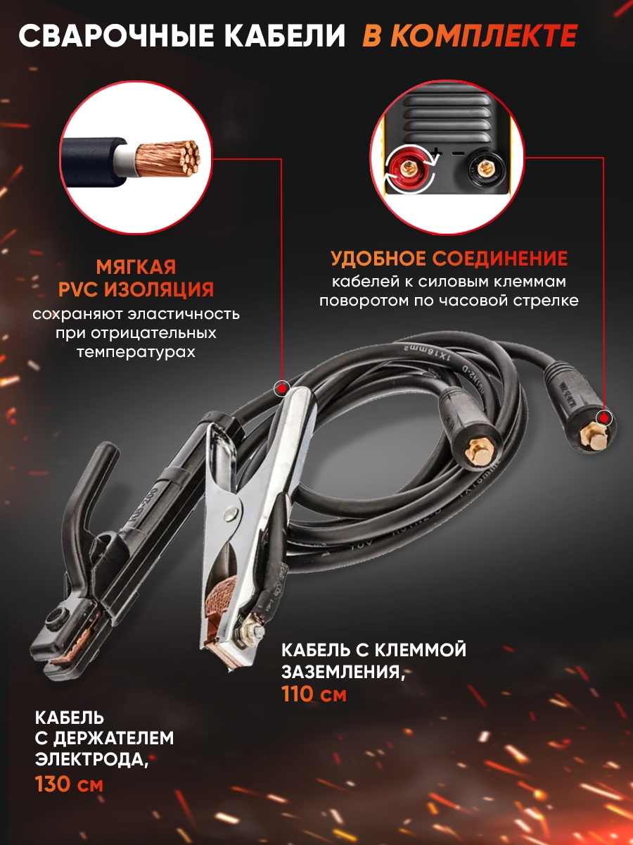 - КомплектацияСварочный аппарат, кабель с электрододержателем, кабель с клеммой заземления, руководство по эксплуатации.