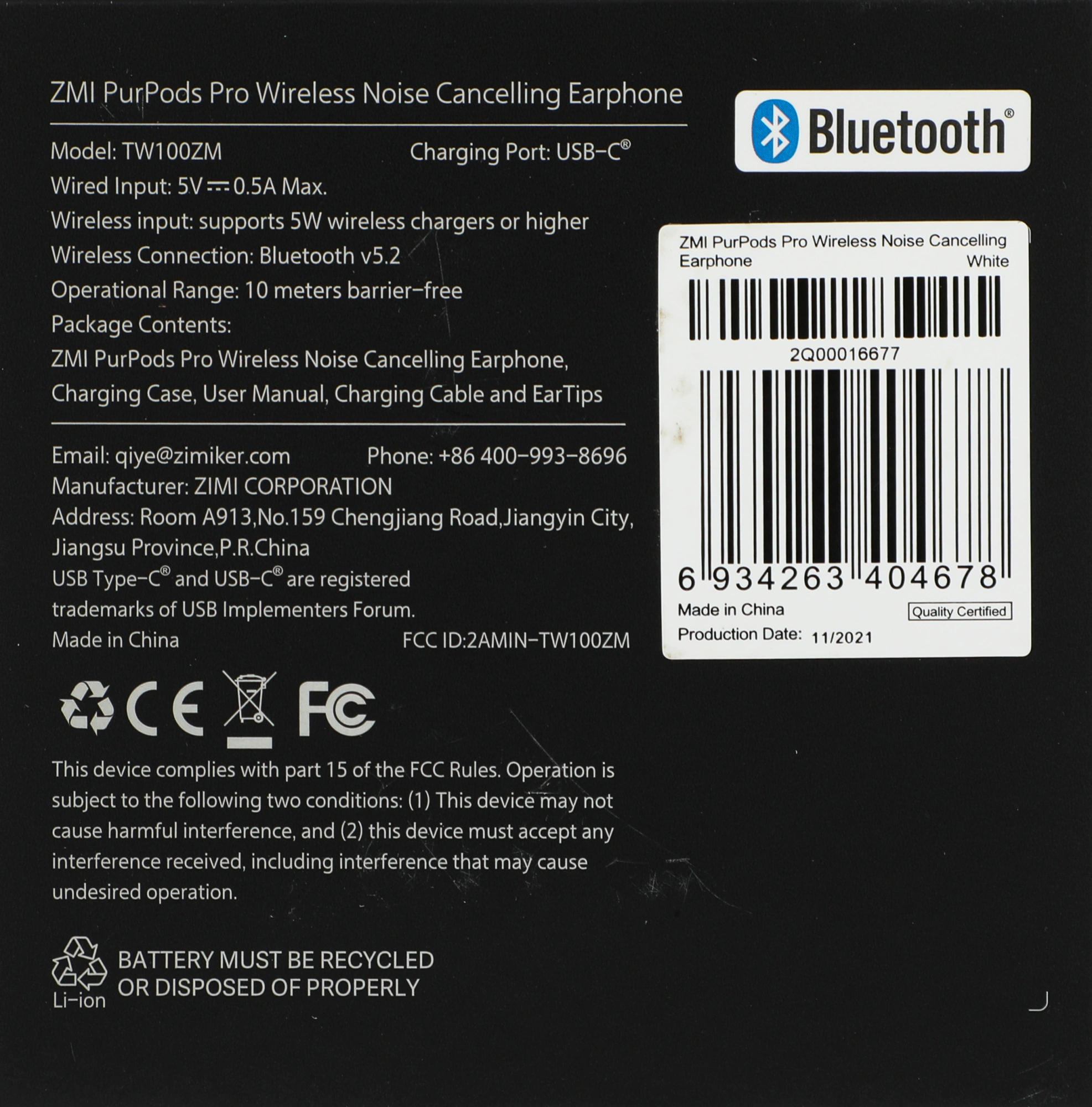 Гарнитура внутриканальные ZMI PurPods Pro TW100ZM белый беспроводные bluetooth в ушной раковине