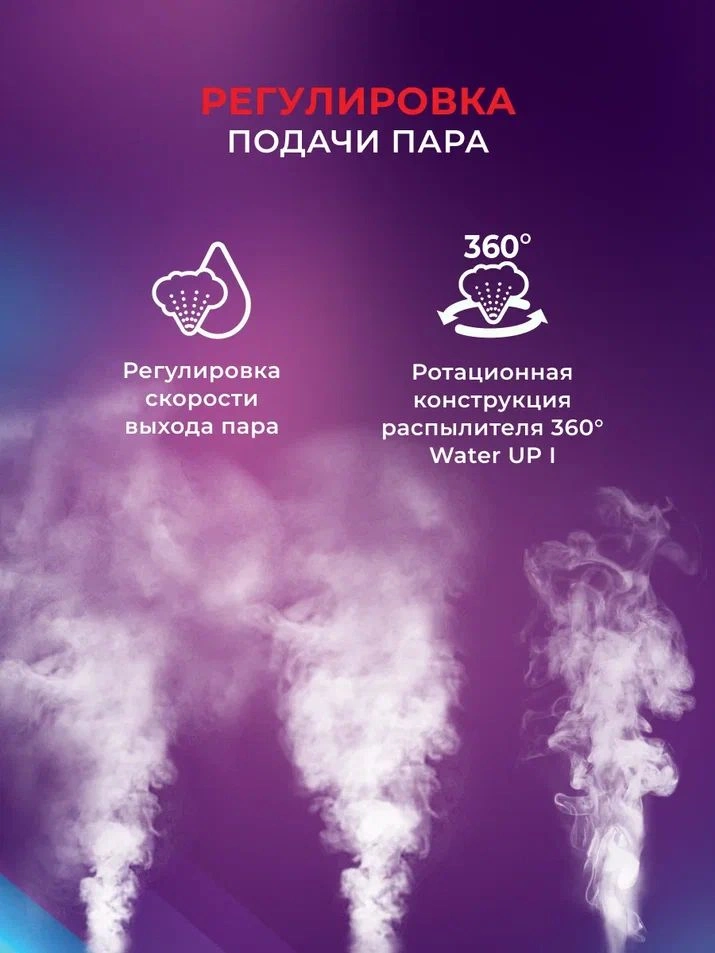 - ОсобенностиЭффективная ароматизация воздуха Aroma Nature. Свободный выбор направления подачи пара. Ротационная конструкция распылителя 360° Water UP I. Плавная регулировка скорости выхода пара. Бесшумная работа для комфортного использования во время сна и отдыха.
