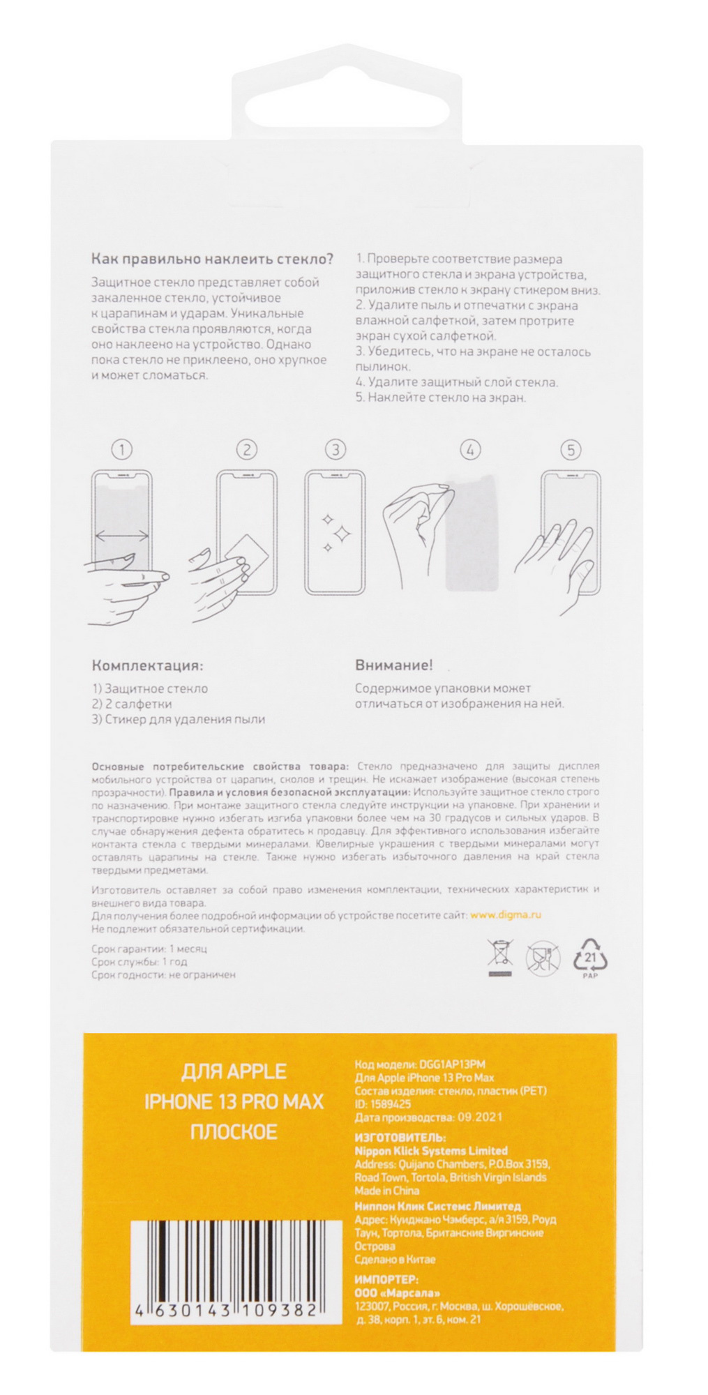 Защитное стекло для экрана Digma DGG1AP13PM для Apple iPhone 13 Pro Max/14 Pro Max прозрачная 1шт.