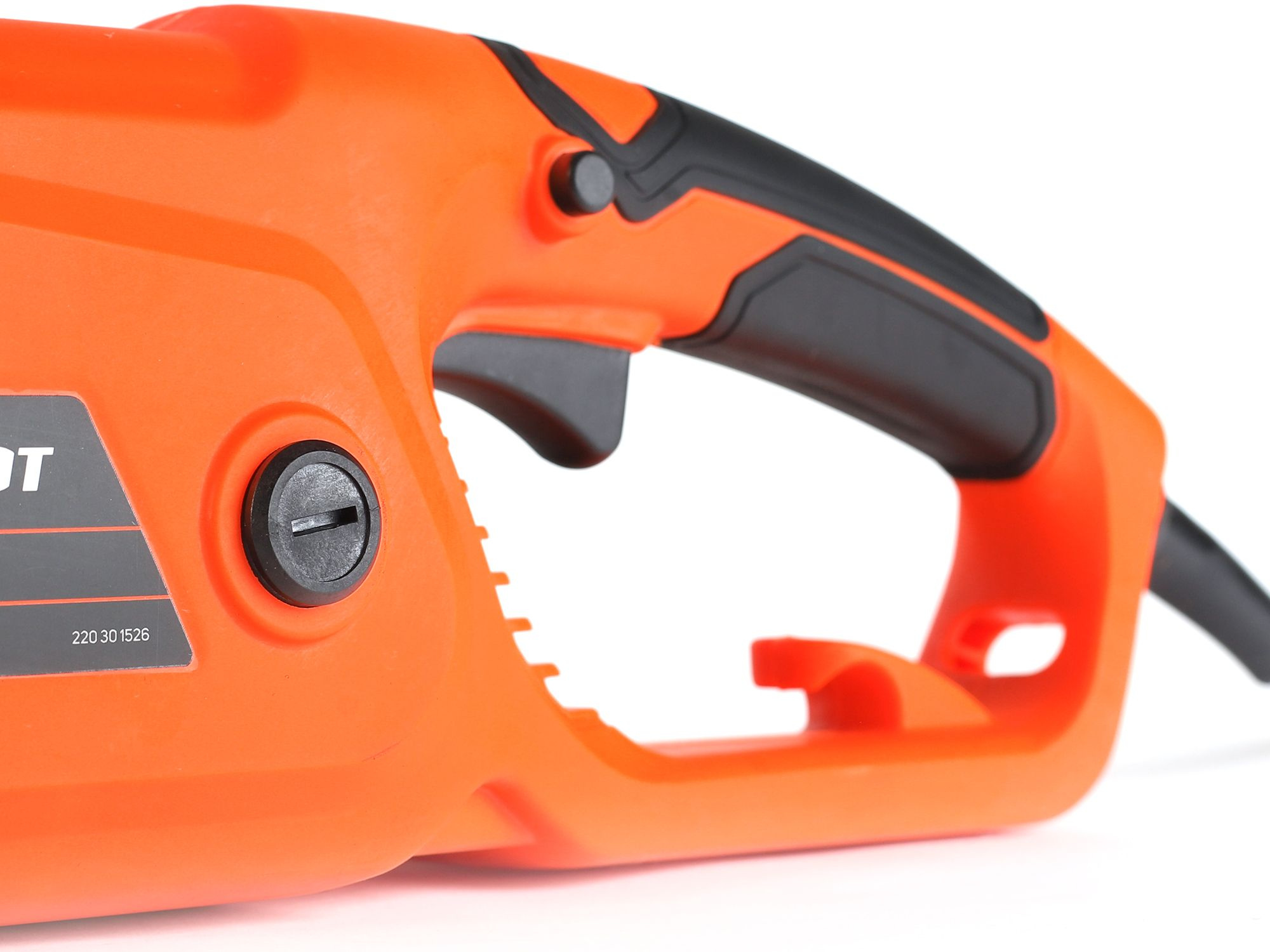 - ОсобенностиРычаг инерционного тормоза - экстренное торможение пильной цепи в случае её отскока, предусмотрена скоба крепления сетевого кабеля