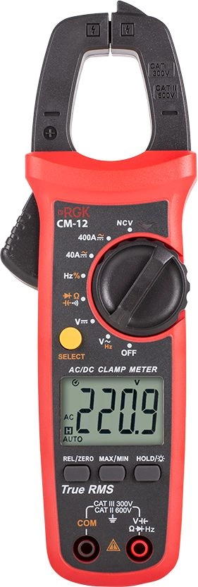 Цифровые токовые клещи RGK CM-12 используются для измерения силы тока до 400 А в тех случаях, когда недопустимо повреждение изоляции или приостановка работы электросистемы предприятия. Прибор ориентирован на специалистов сферы энергетики, но может с успехом решать и бытовые задачи по проверке.