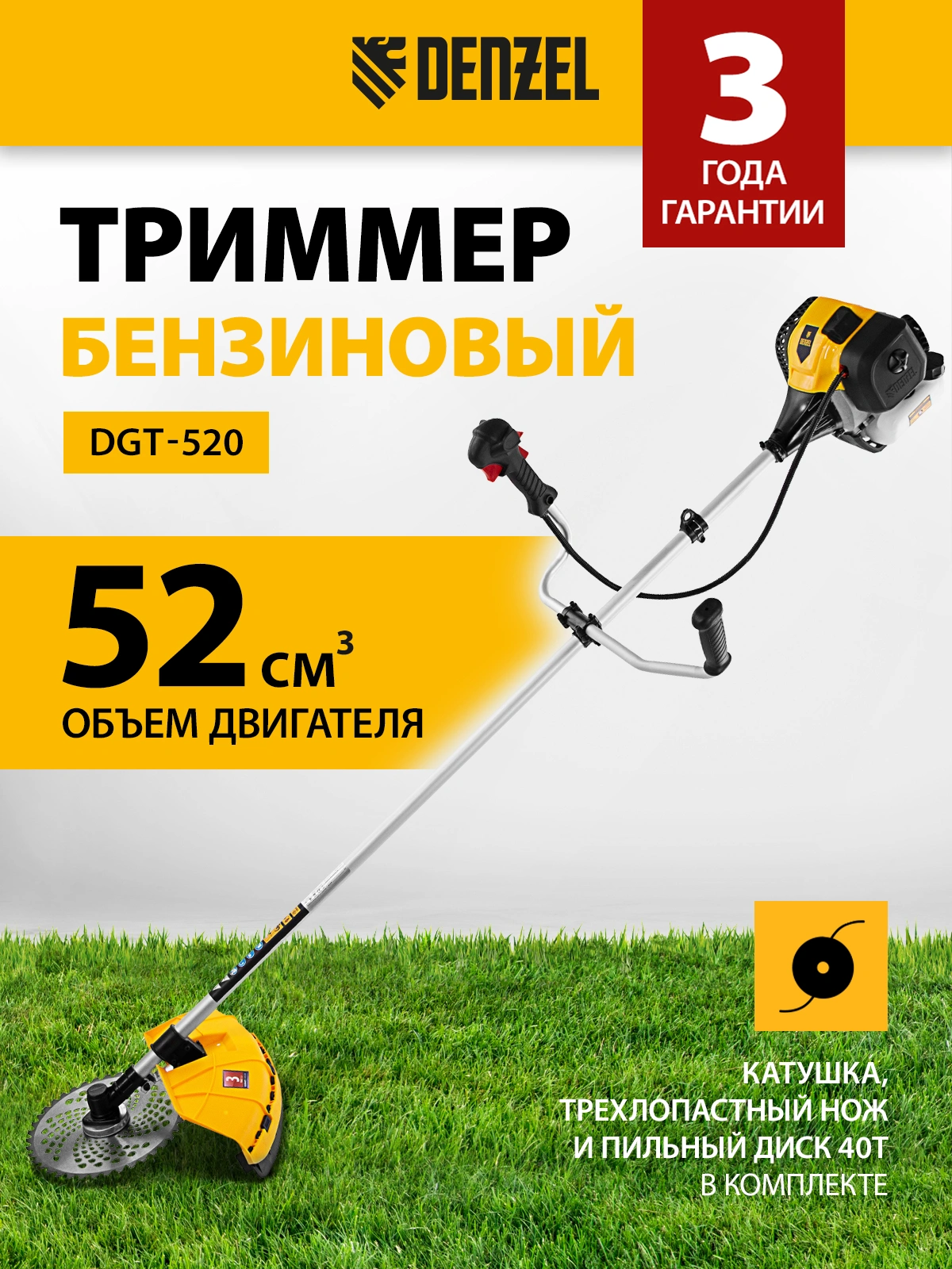 Триммер бензиновый Denzel DGT-520 2200Вт 3л.с. неразбор.штан. реж.эл.:леска/нож