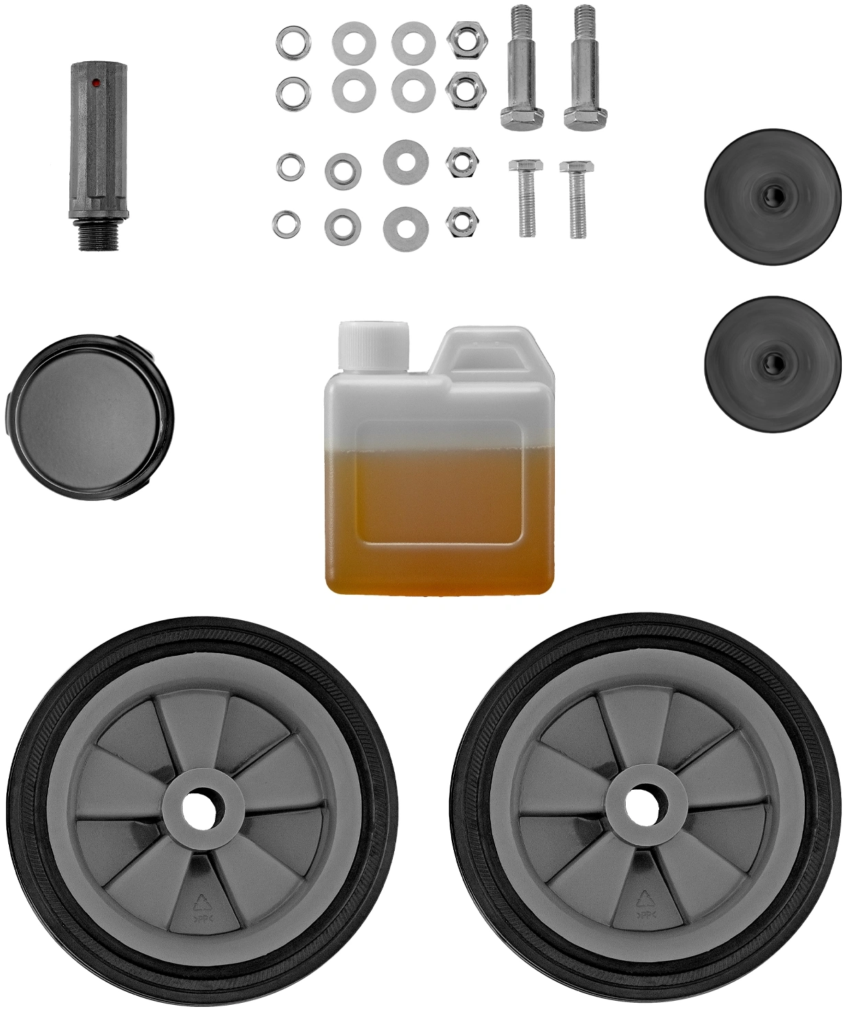 - КомплектацияКомпрессор, воздушный фильтр, антивибрационные опоры, колеса, крепеж, масло компрессорное, инструкция.