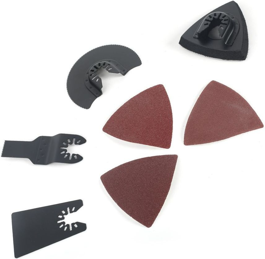 - Дополнительно в комплектеМногофункциональный инструмент, плитка для шлифовальной бумаги, шлифовальная бумага - 3 шт., прямой резак по дереву, сегментный пильный диск, скребок, инструкция, упаковка.