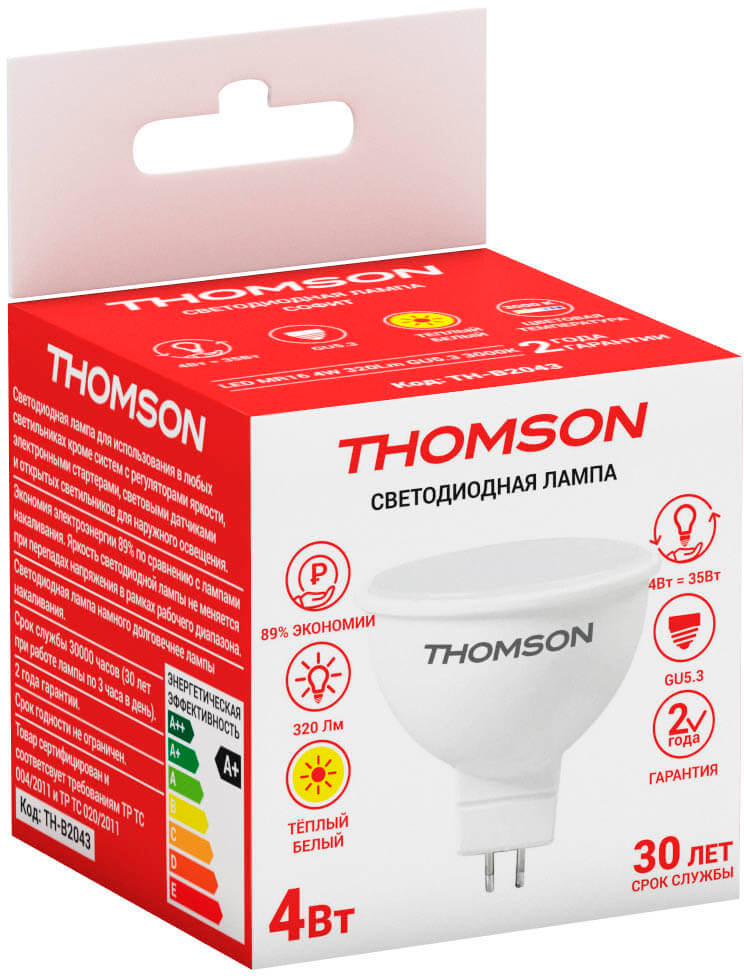 Лампа светодиодная Thomson TH-B2043 4Вт цок.:GU5.3 рефлек. 220B св.свеч.бел.теп. MR16