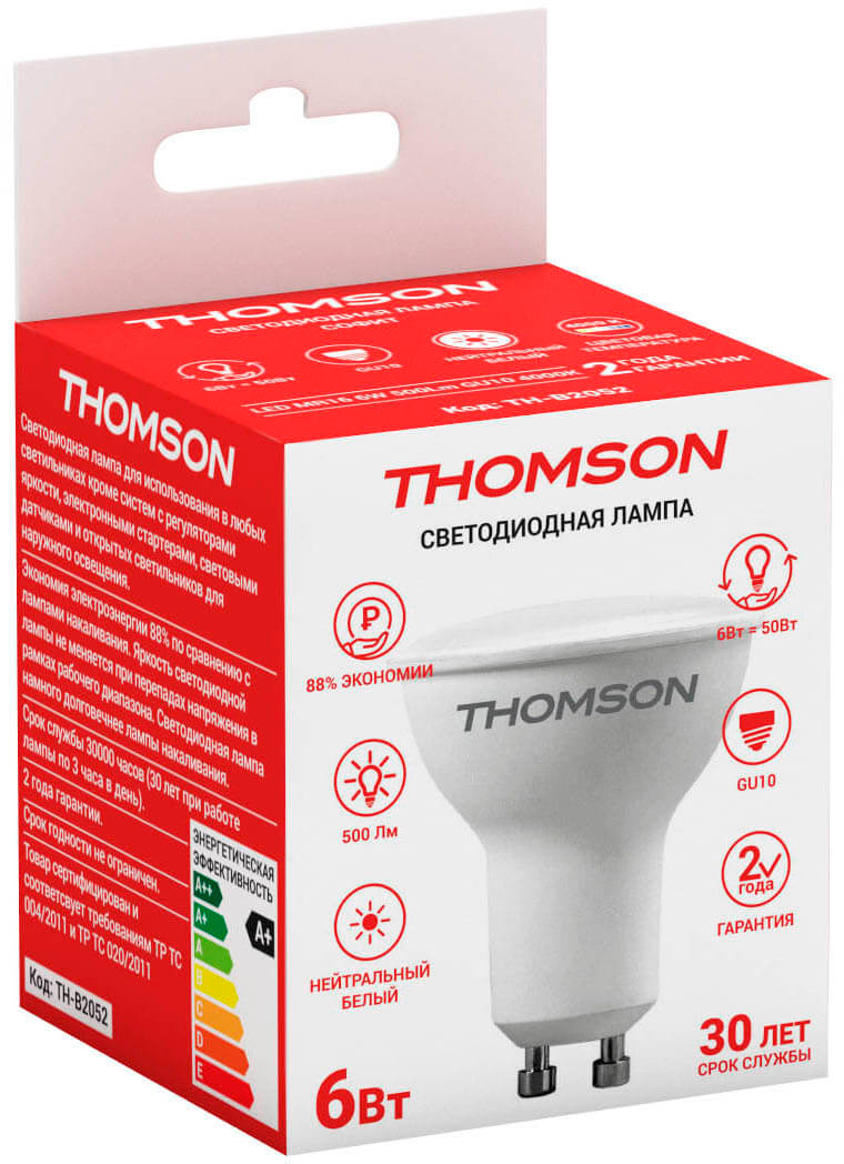 Лампа светодиодная Thomson TH-B2052 6Вт цок.:GU10 рефлек. 220B св.свеч.бел.нейт. MR16 (упак.:1шт)
