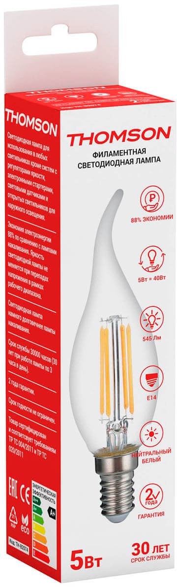 Лампа филам. Thomson Filament TH-B2074 5Вт цок.:E14 свеча 220B св.свеч.бел.нейт. Tail Candle (упак.:1шт)