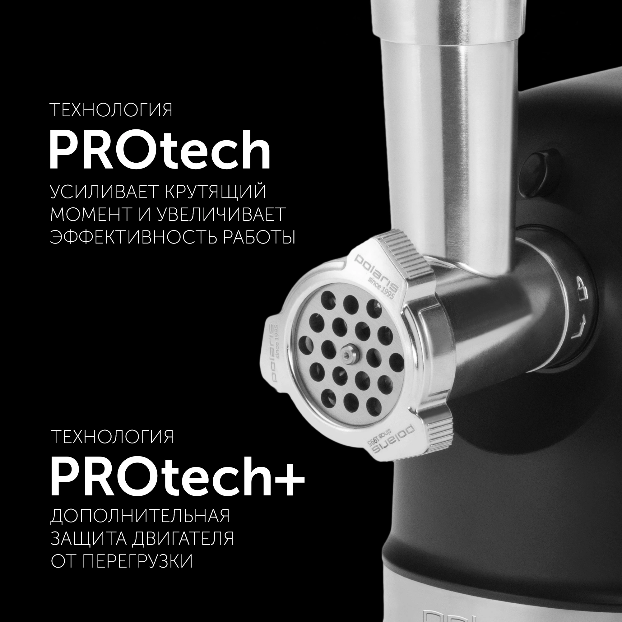 Многофункциональная мясорубка Polaris PMG 2582 оснащена надежным мотором мощностью 2500 Вт, что обеспечивает высокую производительность прибора: до 2,7 кг мяса в минуту. Технология PROTech усиливает крутящий момент и увеличивает эффективность работы.