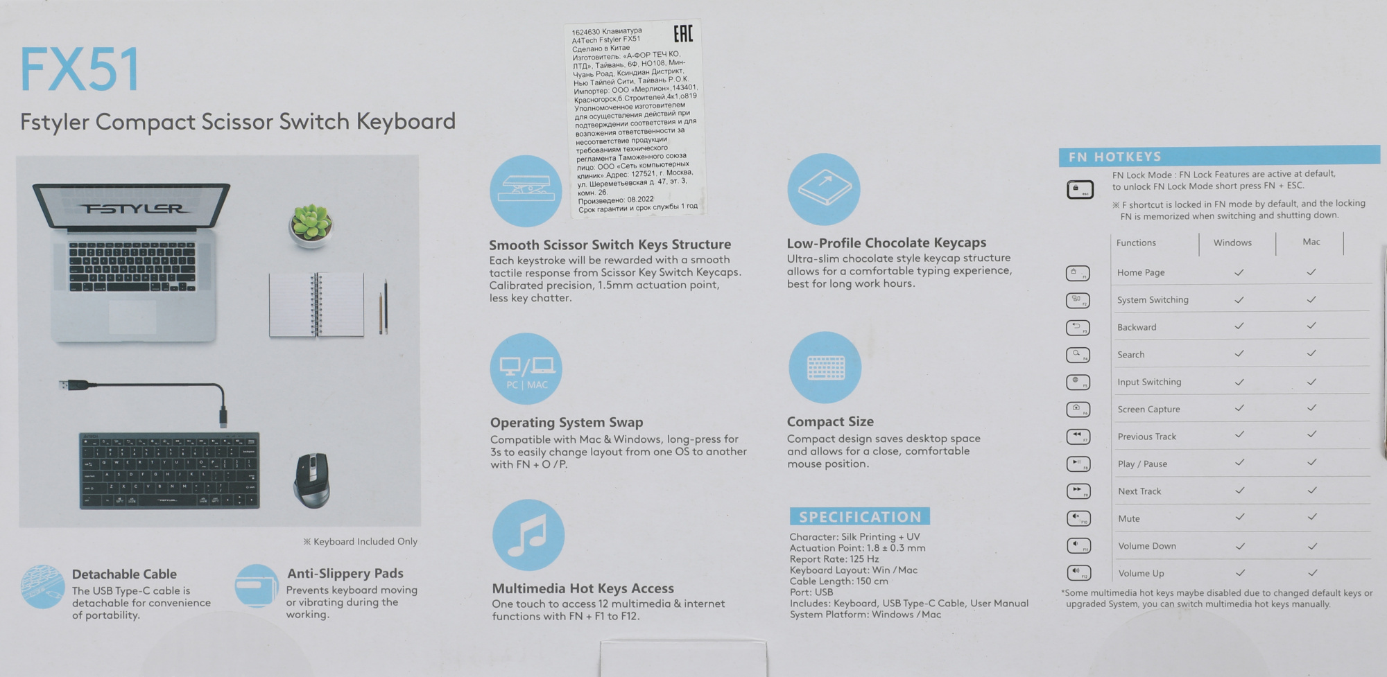 - ОсобенностиКомпактный размер. Ножничный тип нажатия клавиш. Горячие мультимедийные клавиши: 12 Fn.