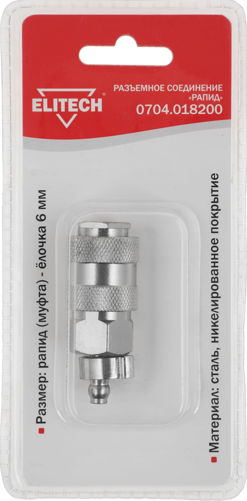 Переходник рапид – ёлочка 6 мм с обжимным кольцом 6-11 мм. Elitech 0704.018200 применяется для соединения различных частей пневмосистем. С одной стороны фитинг имеет ёлочку — 6 мм., с другой быстросъемное соединение — рапид мама. Созданная конструкция обладает высокой надежностью и герметичностью.