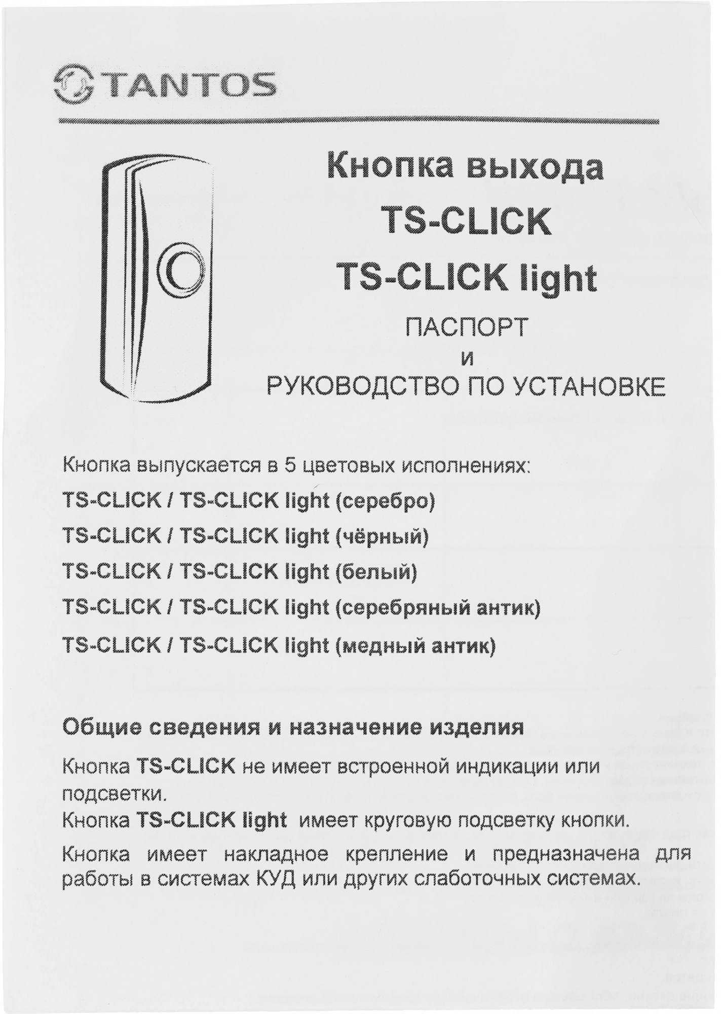 - Комплектациякнопка, паспорт
