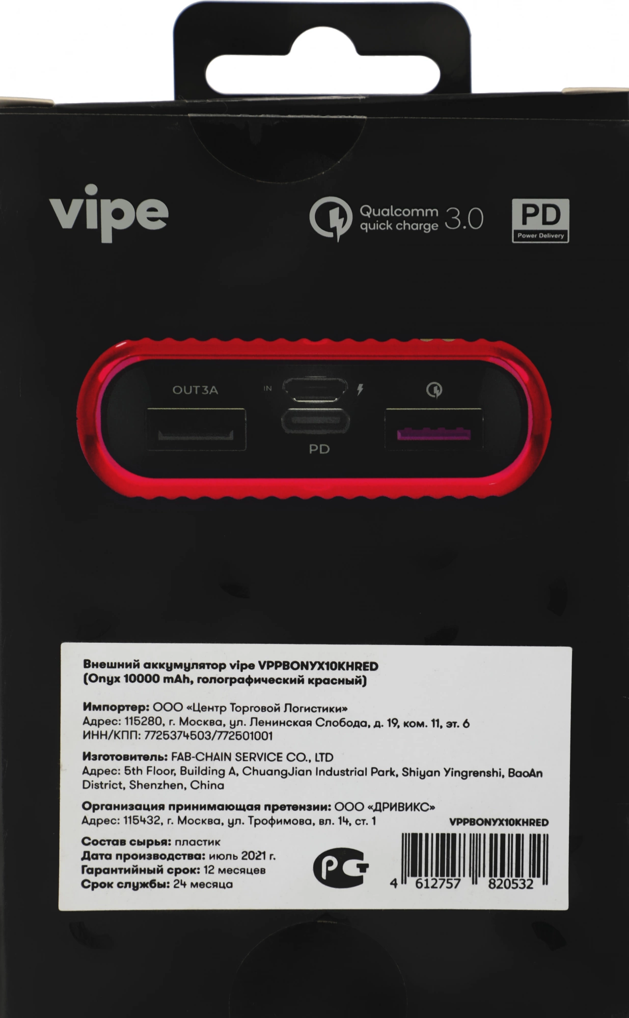 Мобильный аккумулятор Vipe Onyx 10000mAh QC3.0/PD3.0 18W 3A USB-A/USB-C красный (VPPBONYX10KHRED)