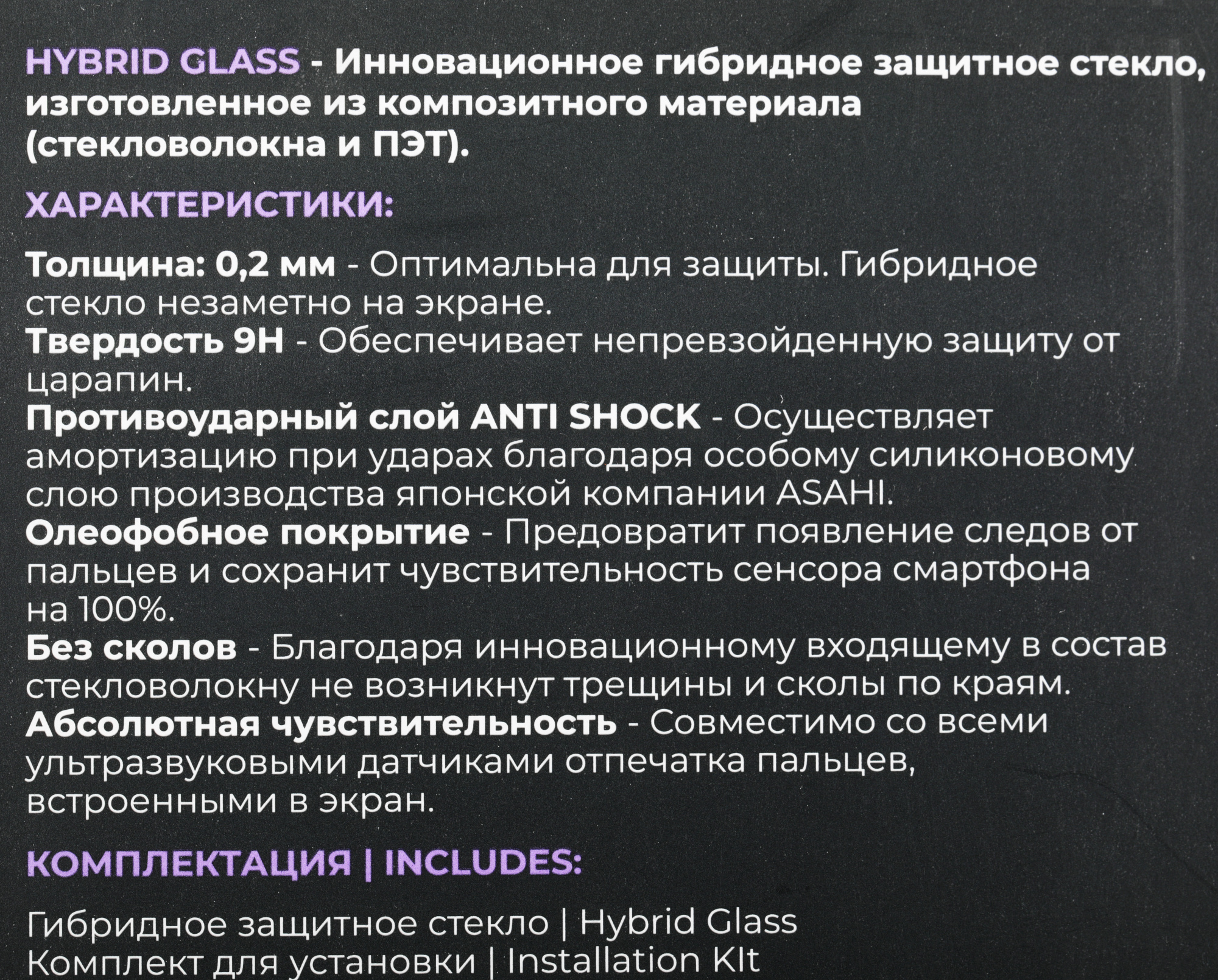- ОсобенностиТолщина 0,2 мм, твёрдость 9H, противоударный слой, олеофобное покрытие, не скалывается по краям.