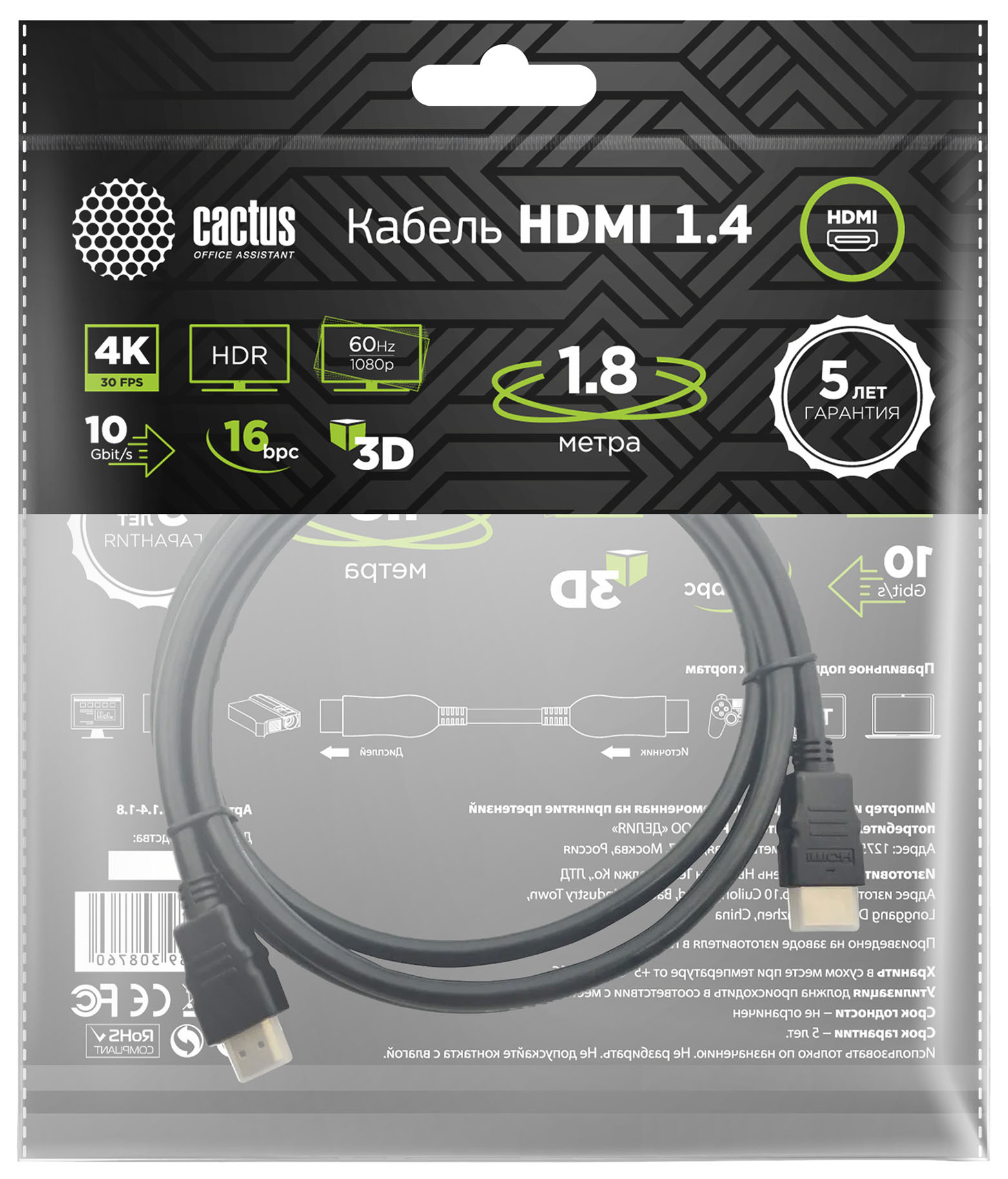 Кабель аудио-видео Cactus CS-HDMI.1.4-1.8 HDMI (m)/HDMI (m) 1.8м. Позолоченные контакты черный