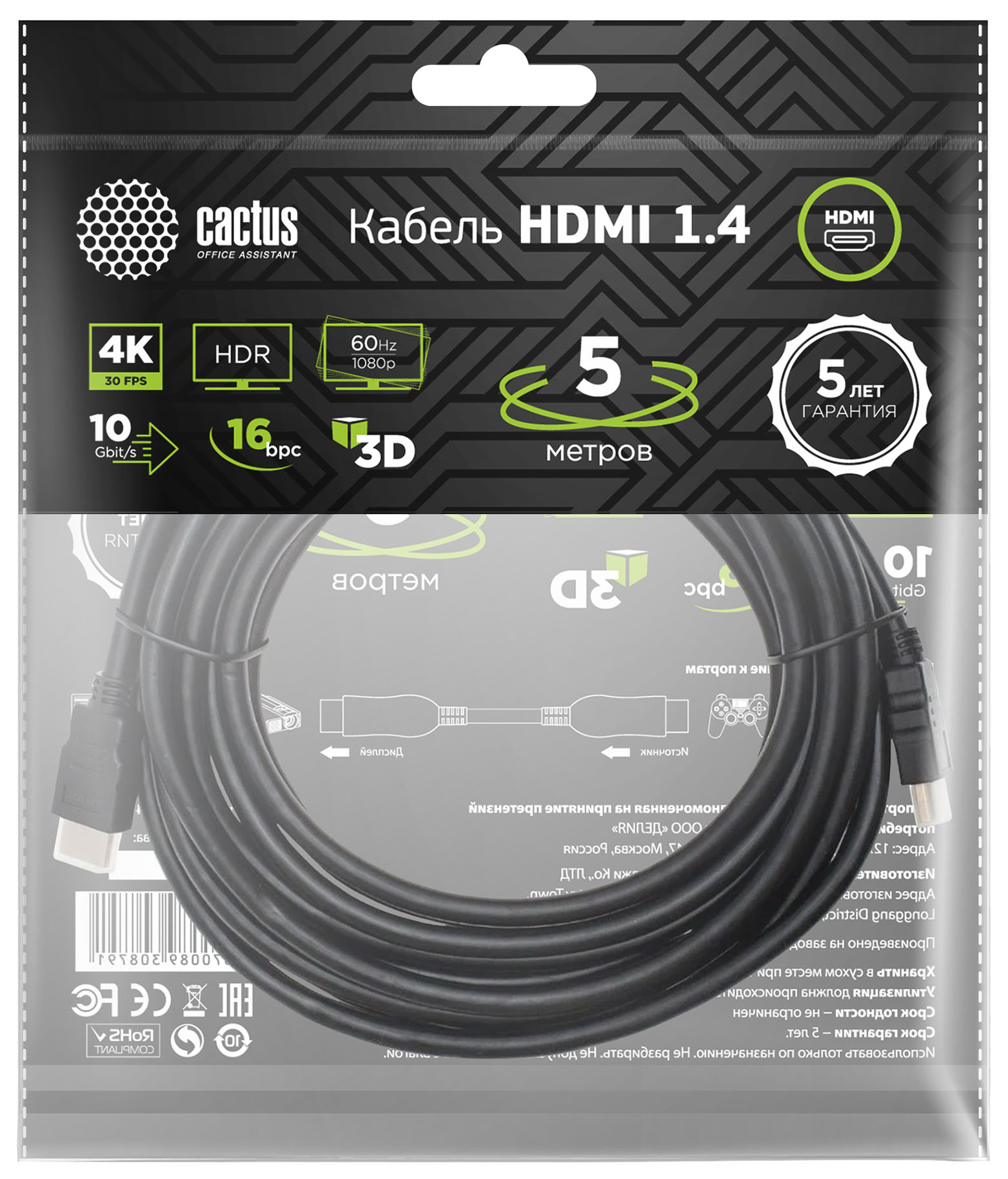 Кабель аудио-видео Cactus CS-HDMI.1.4-5 HDMI (m)/HDMI (m) 5м. Позолоченные контакты черный