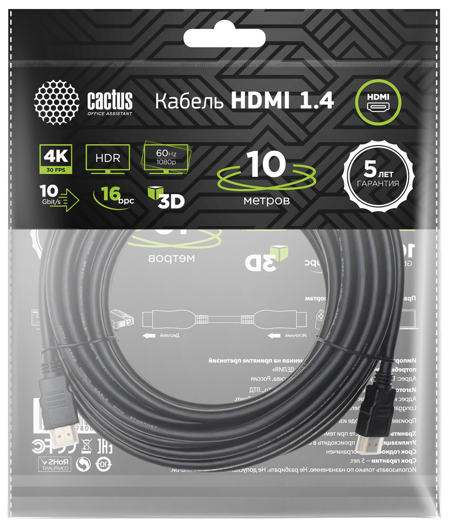Кабель аудио-видео Cactus CS-HDMI.1.4-10 HDMI (m)/HDMI (m) 10м. позолоч.конт. черный