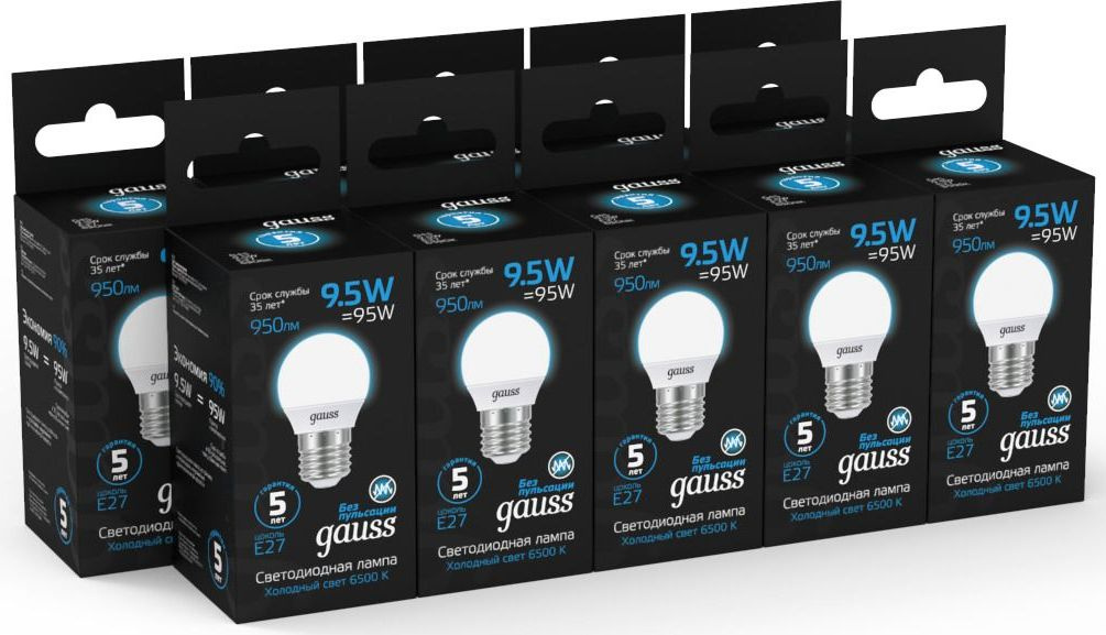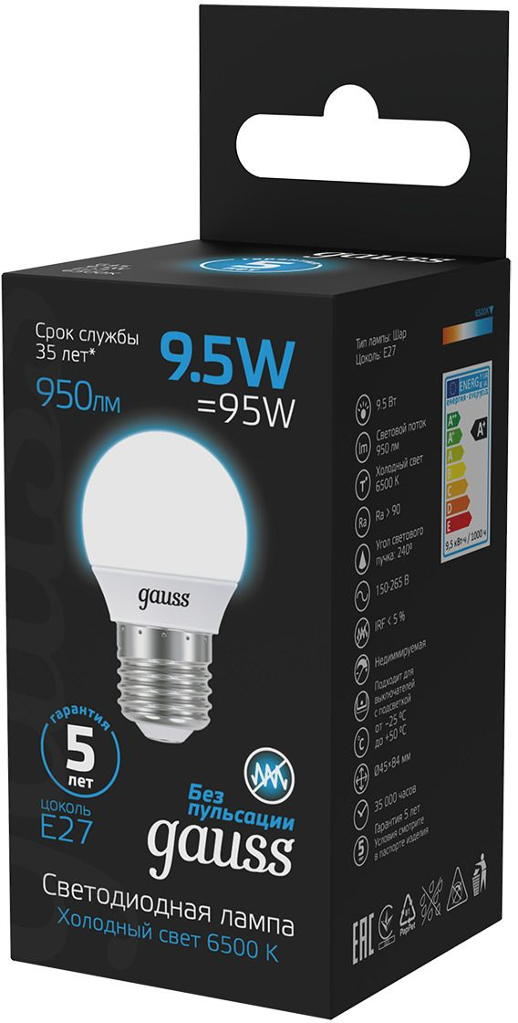 Лампа светодиодная Gauss 105102310 9.5Вт цок.:E27 шар 220B св.свеч.бел.хол. (упак.:10шт)