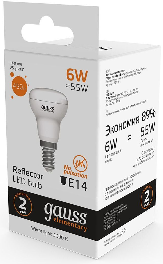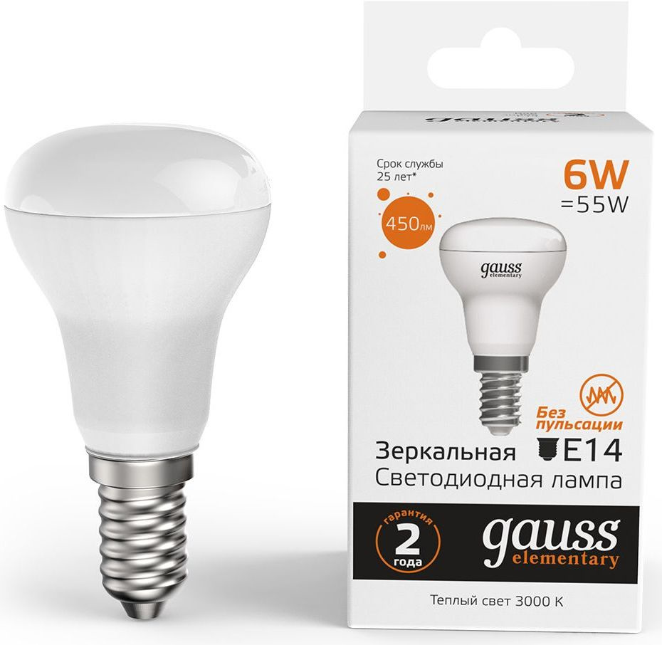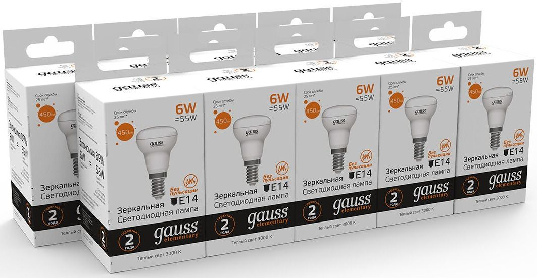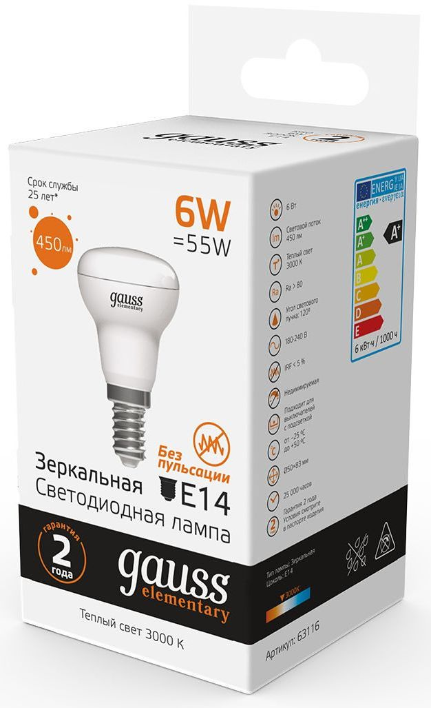 Лампа светодиодная Gauss Elementary 63116 6Вт цок.:E14 рефлек. 220B 3000K св.свеч.бел.теп. (упак.:10шт)