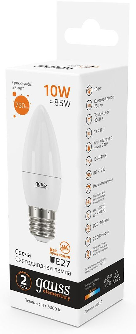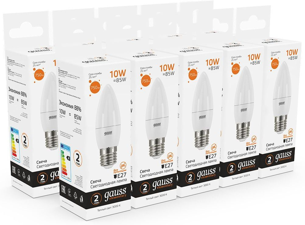 Лампа светодиодная Gauss Elementary 30210 10Вт цок.:E27 свеча 220B св.свеч.бел.теп. (упак.:10шт)