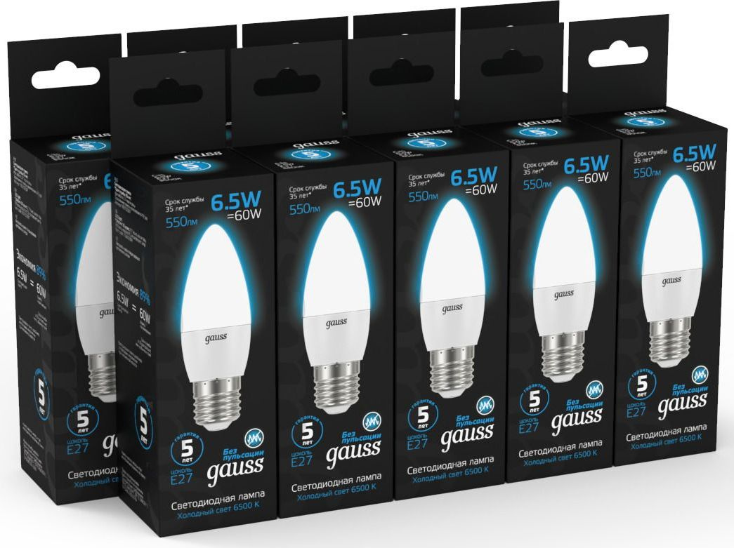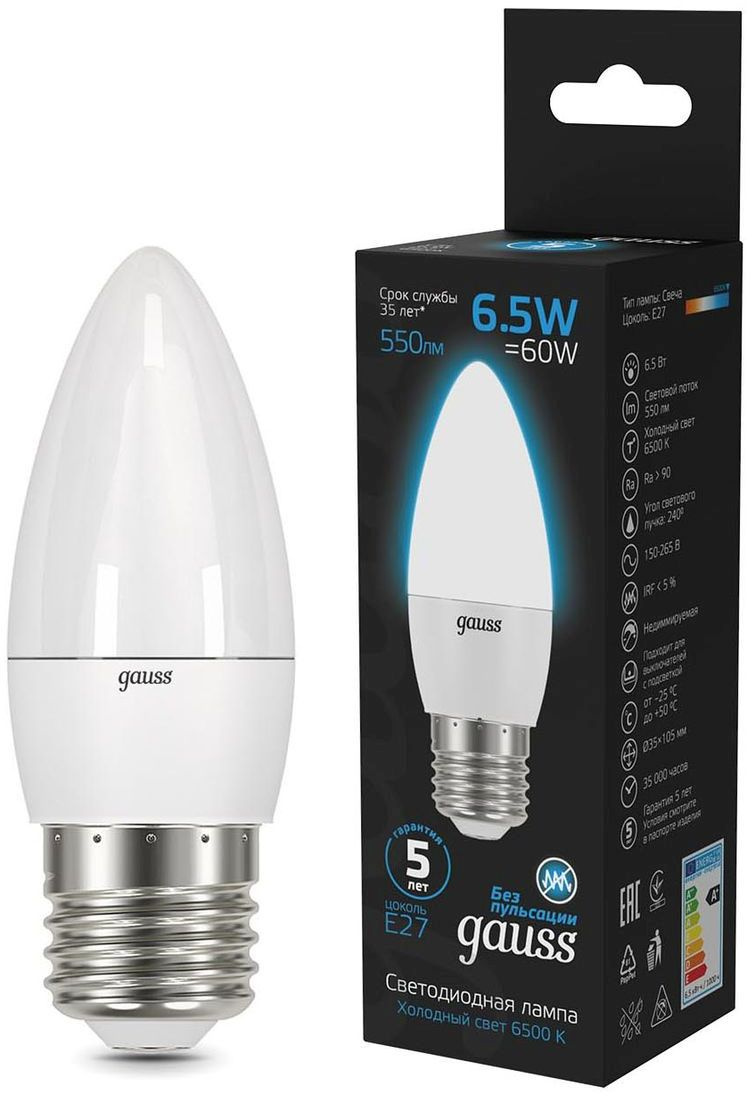 Лампа светодиодная Gauss 103102307 6.5Вт цок.:E27 свеча 220B св.свеч.бел.хол. (упак.:10шт)