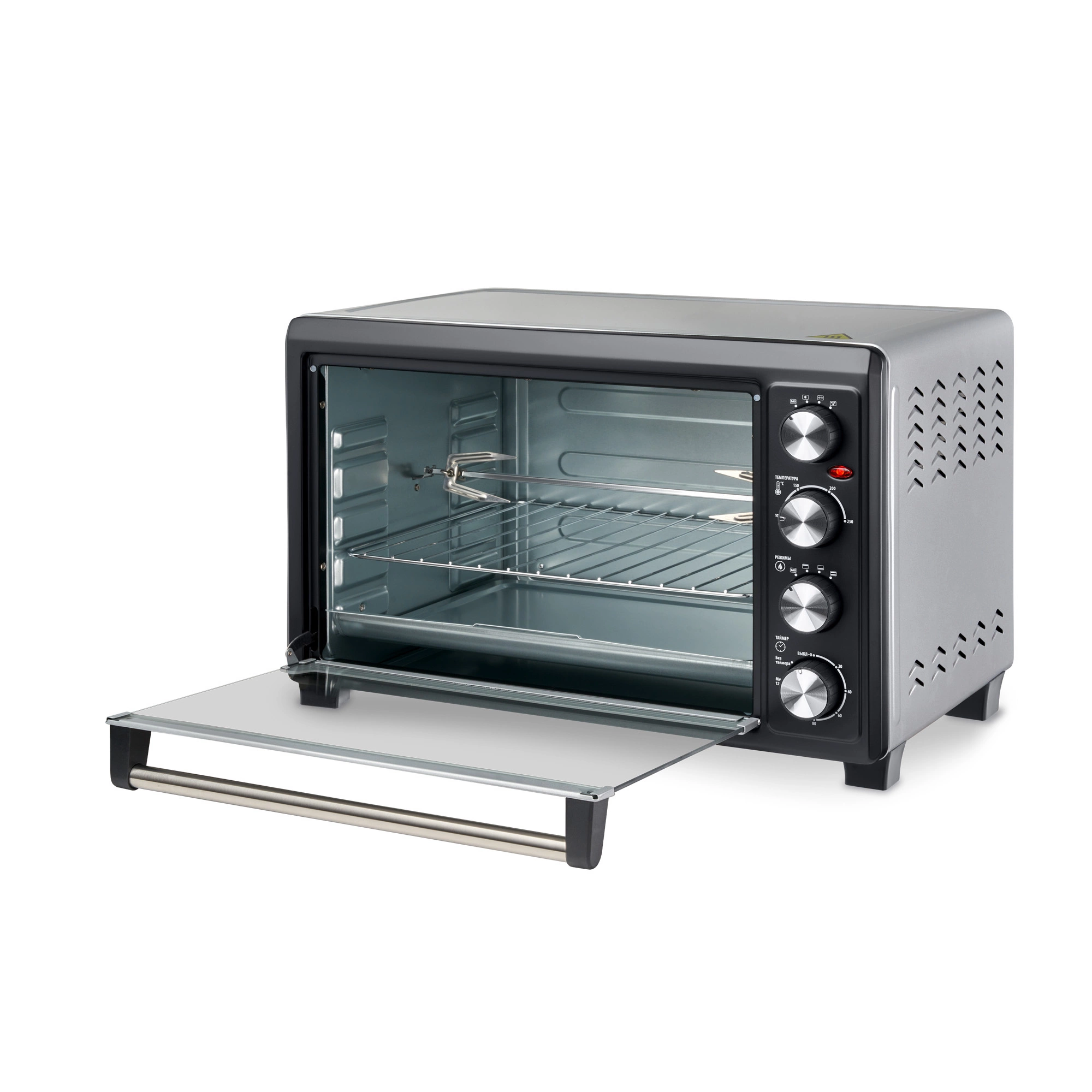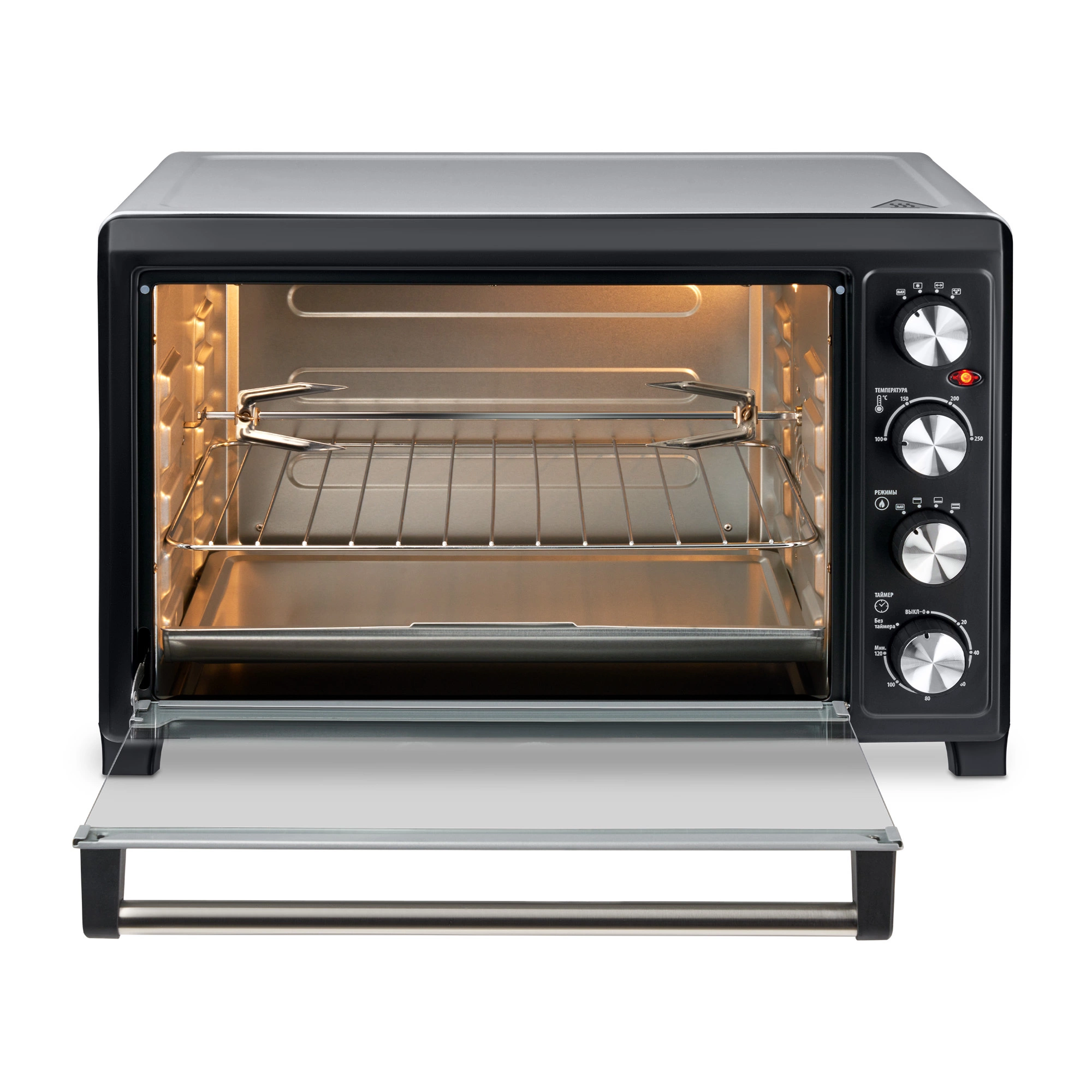 Режимы печи: верхний нагрев, нижний нагрев, одновременный верхний и нижний нагрев + эти же режимы с конвекцией + эти же режимы только с вертелом + эти же режимы с вертелом и конвекцией