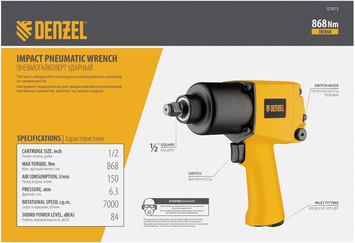 Гайковерт Denzel IW860 150л/мин желтый/черный