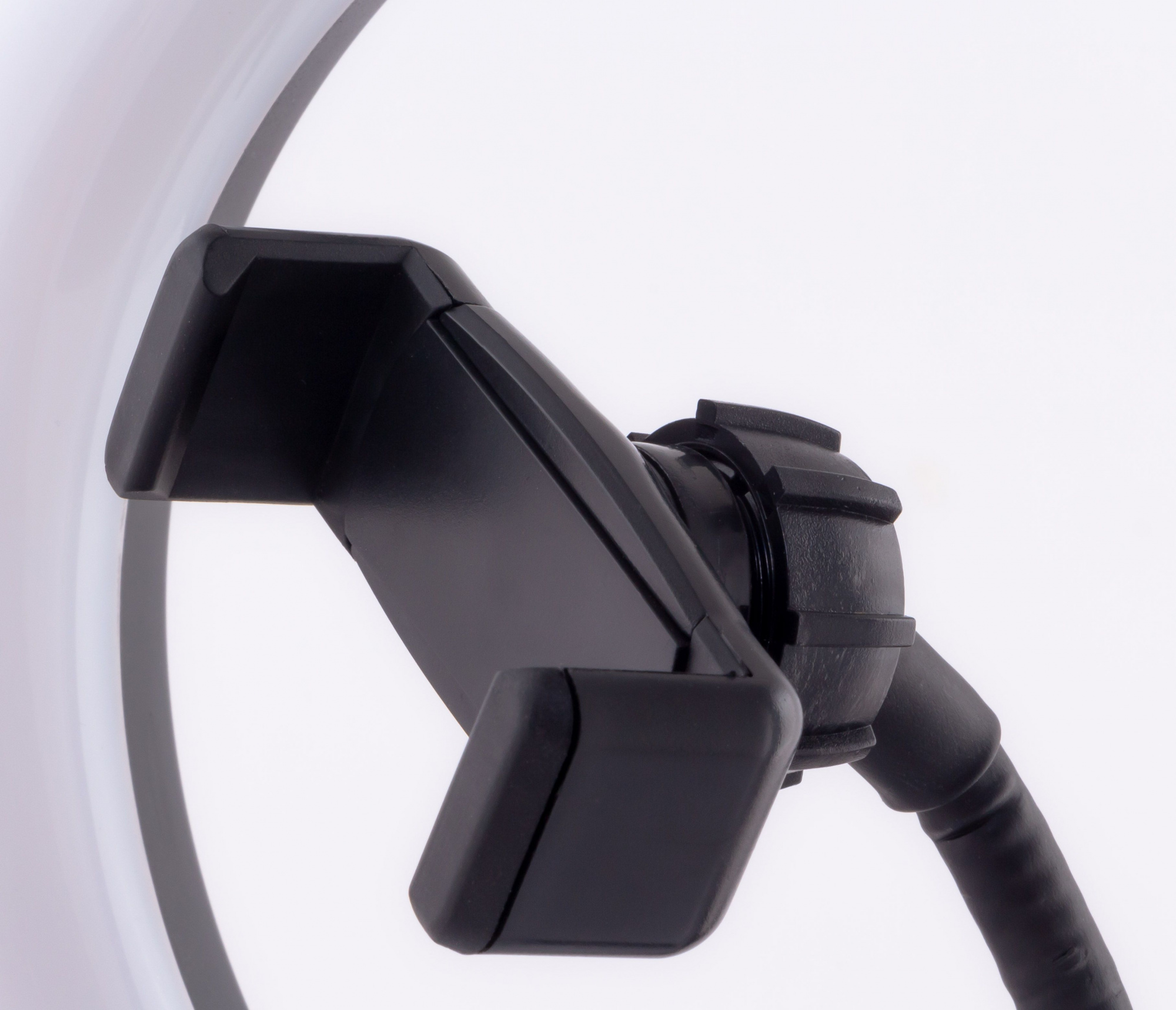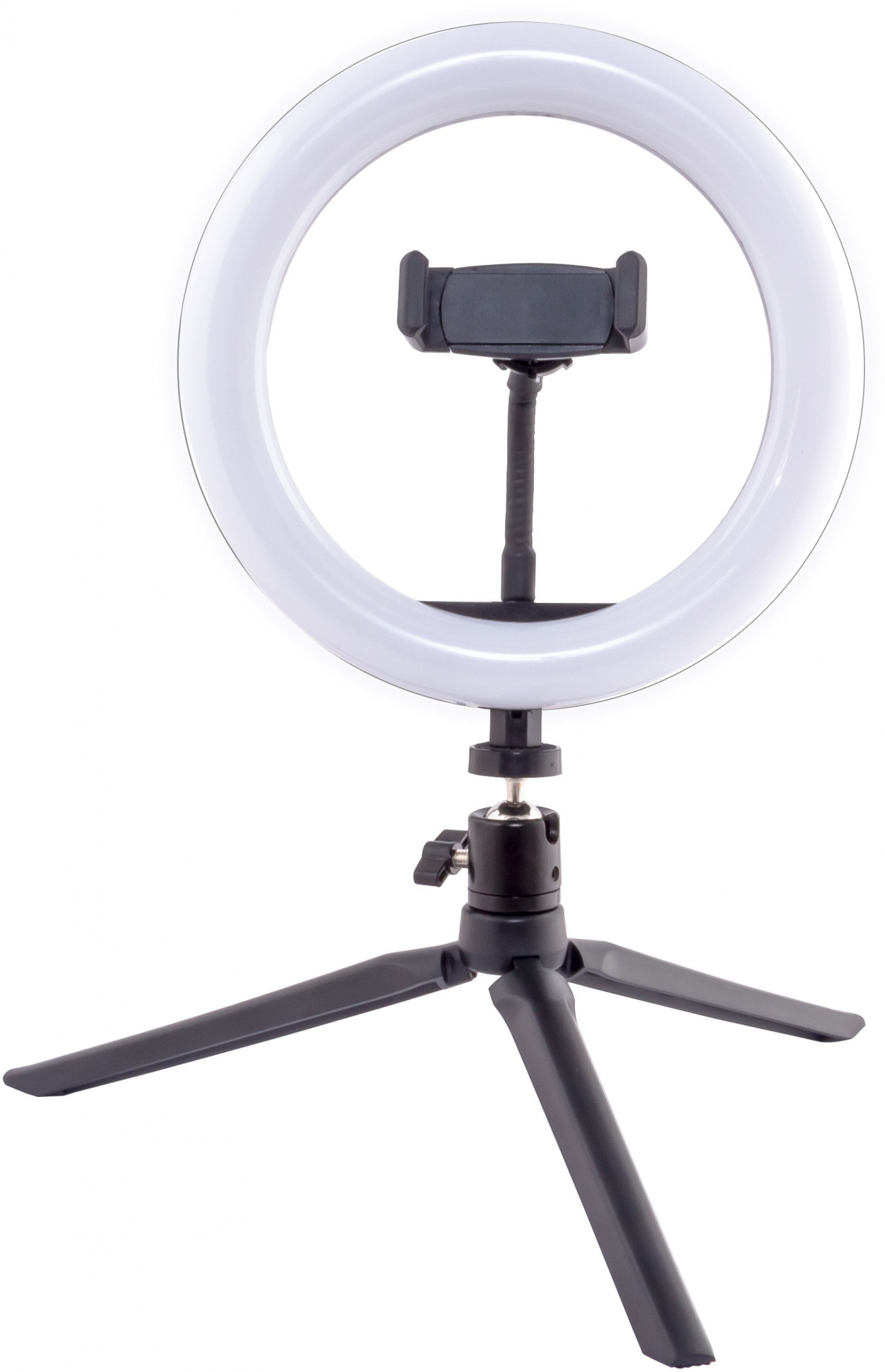 - КомплектацияКольцевая светодиодная лампа. Шнур питания с пультом и USB-разъёмом. Держатель для смартфона. Гибкое шарнирное крепление (Goose neck). Крепление на стойку (штатив) с интегрированной шаровой головой. Винт регулировки угла наклона лампы. Настольный штатив высотой 5 см. Инструкция