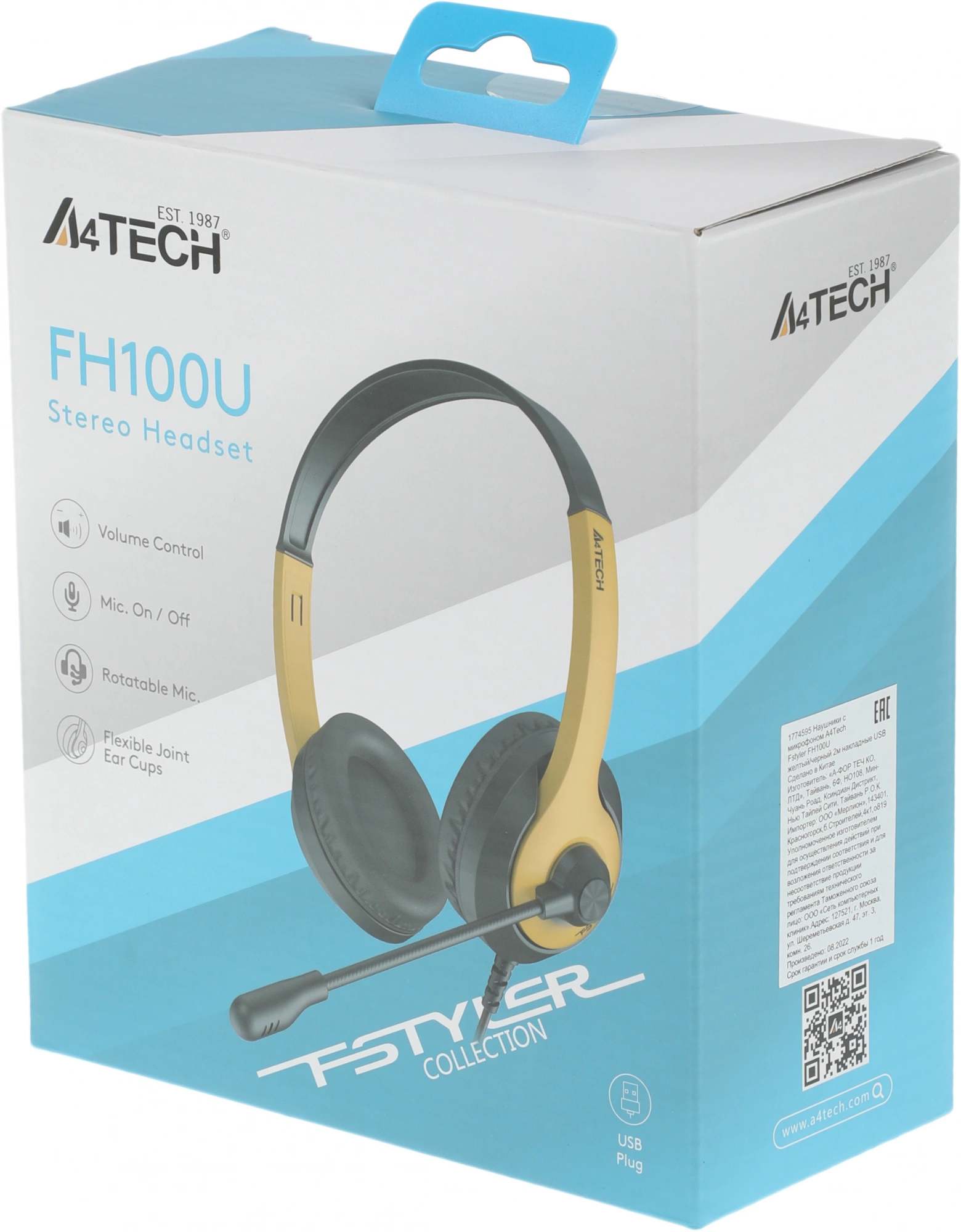 Наушники с микрофоном A4Tech Fstyler FH100U желтый/черный 2м накладные USB оголовье (FH100U (BUMBLEBEE))