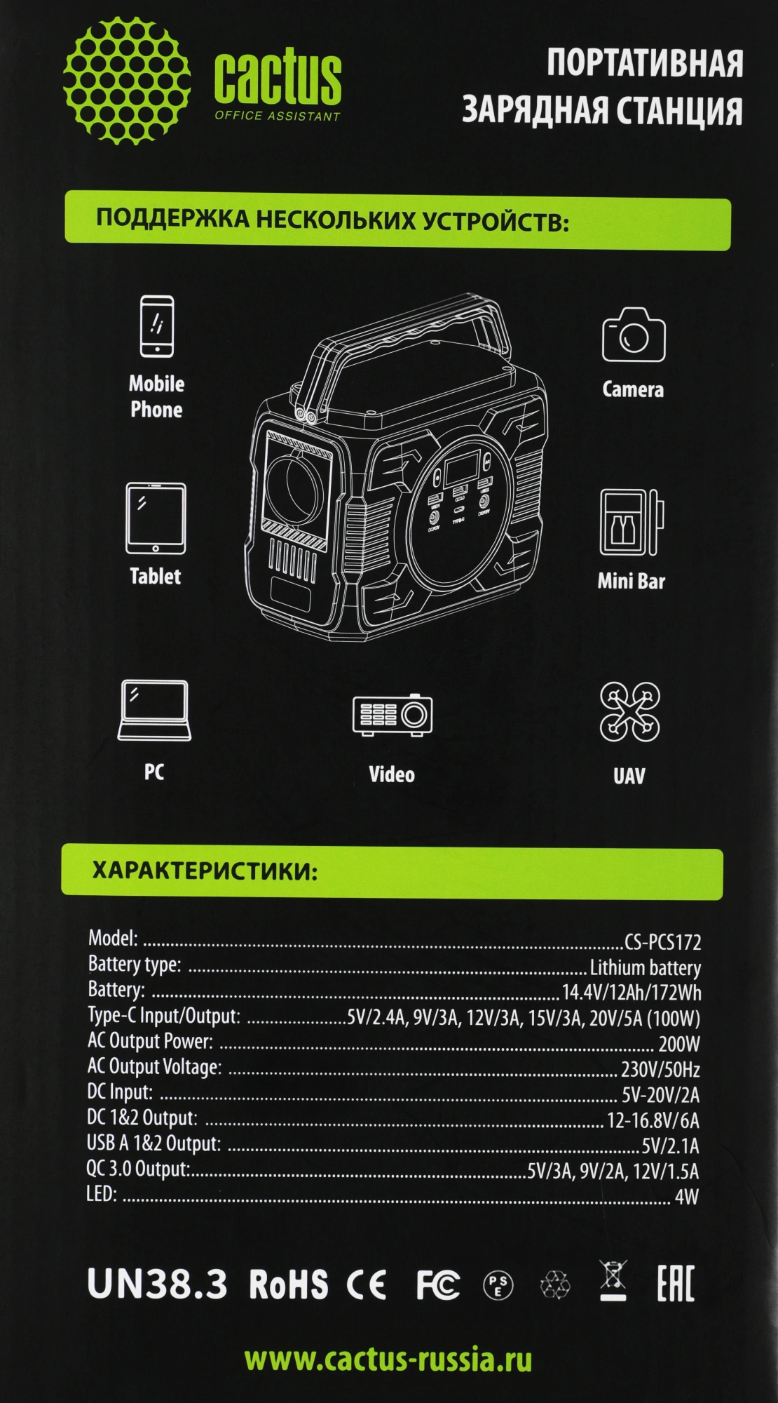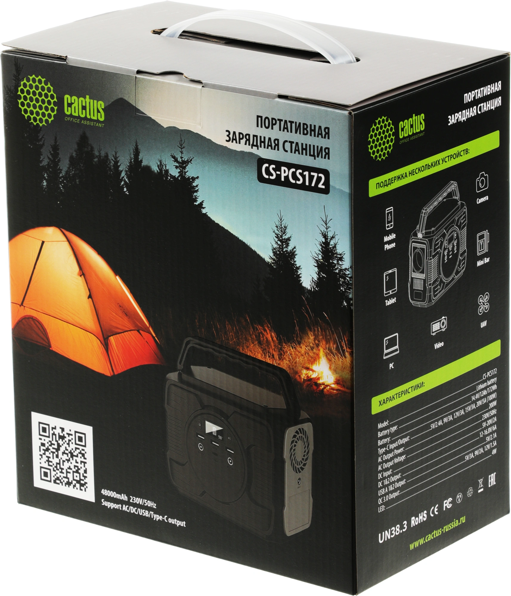 Портативная зарядная станция Cactus CS-PCS172 с ёмкостью 48000 mAh может использоваться в качестве автономного источника питания при отсутствии электросети.