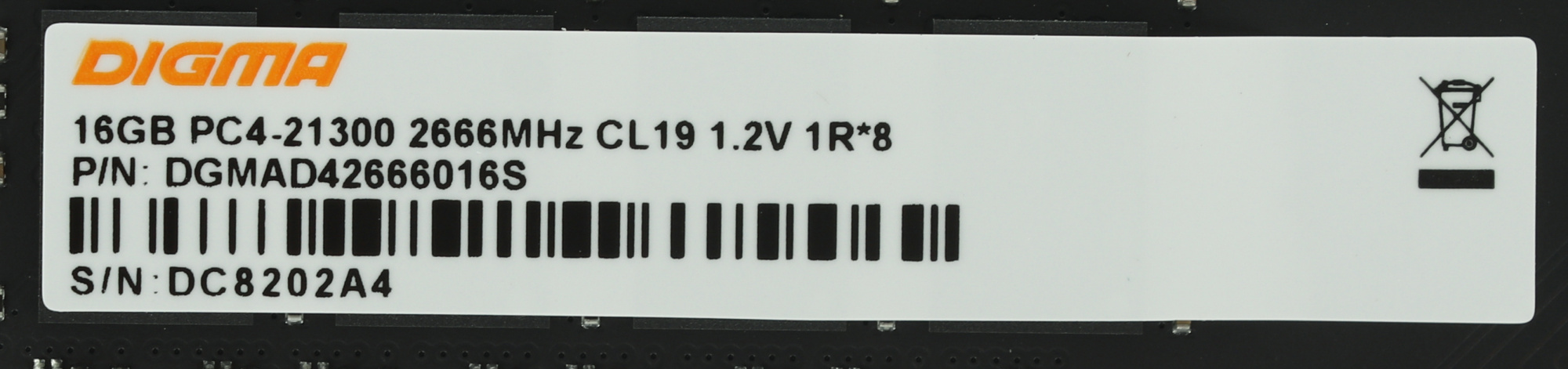 Память DDR4 16GB 2666MHz Digma DGMAD42666016S RTL PC4-21300 CL19 DIMM 288-pin 1.2В single rank Ret