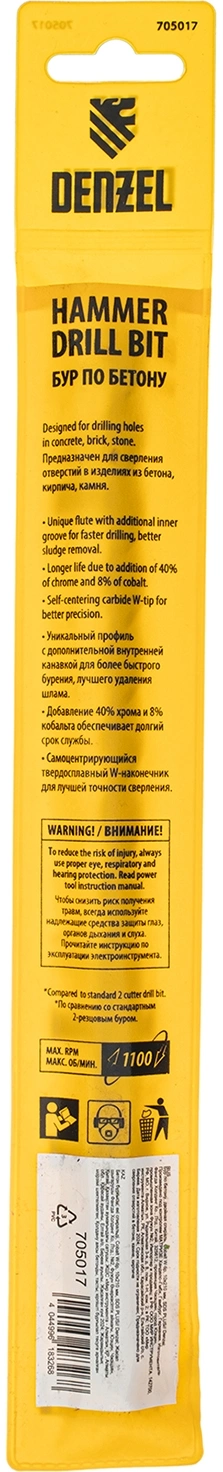 Бур по бетону Denzel арт. 705017 с хвостовиком SDS PLUS и двойной спиралью предназначен для сверления бетона, кирпича и камня. Он используется в качестве оснастки для перфораторов с патроном SDS Plus. Бур оптимален для проведения строительных, ремонтных, монтажных работ.