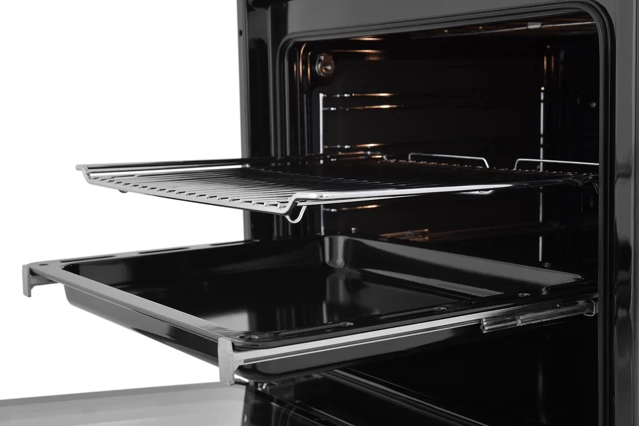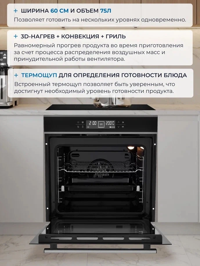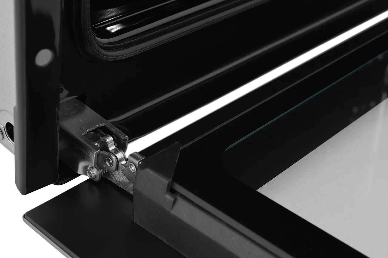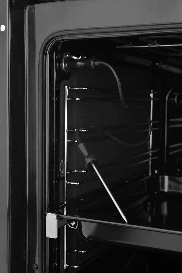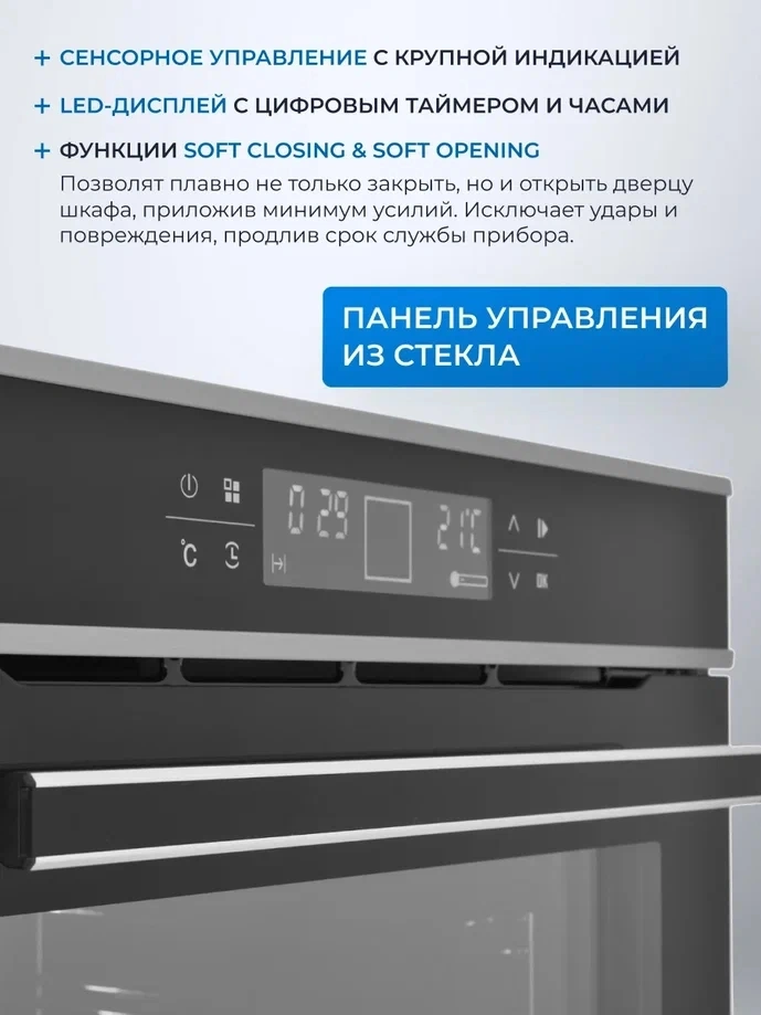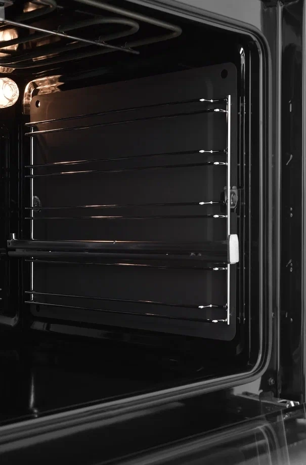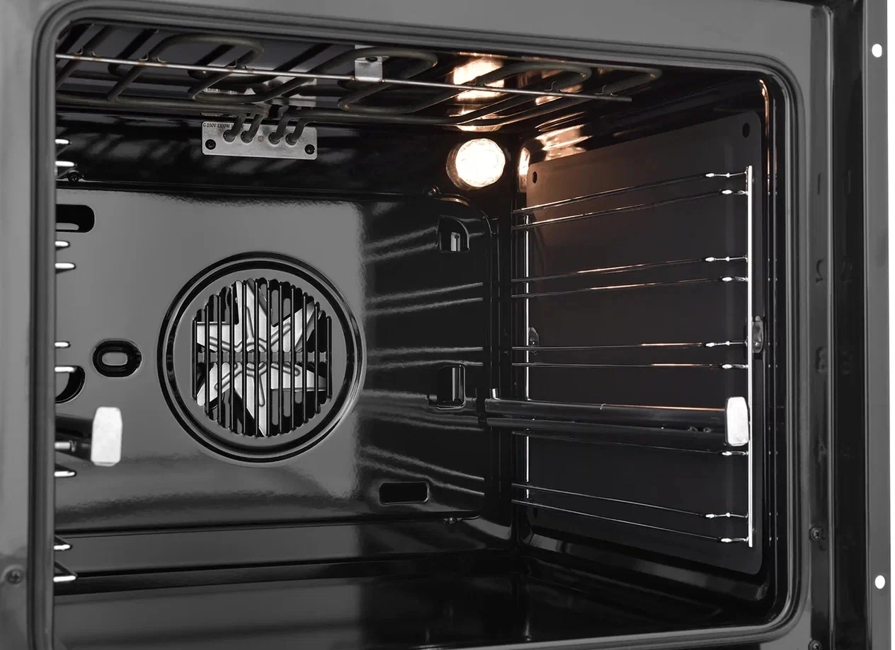 - Особенности конструкциивентилятор охлаждения, дисплей, полностью стеклянная внутренняя поверхность дверцы духовки, телескопические направляющие, электронный программатор
