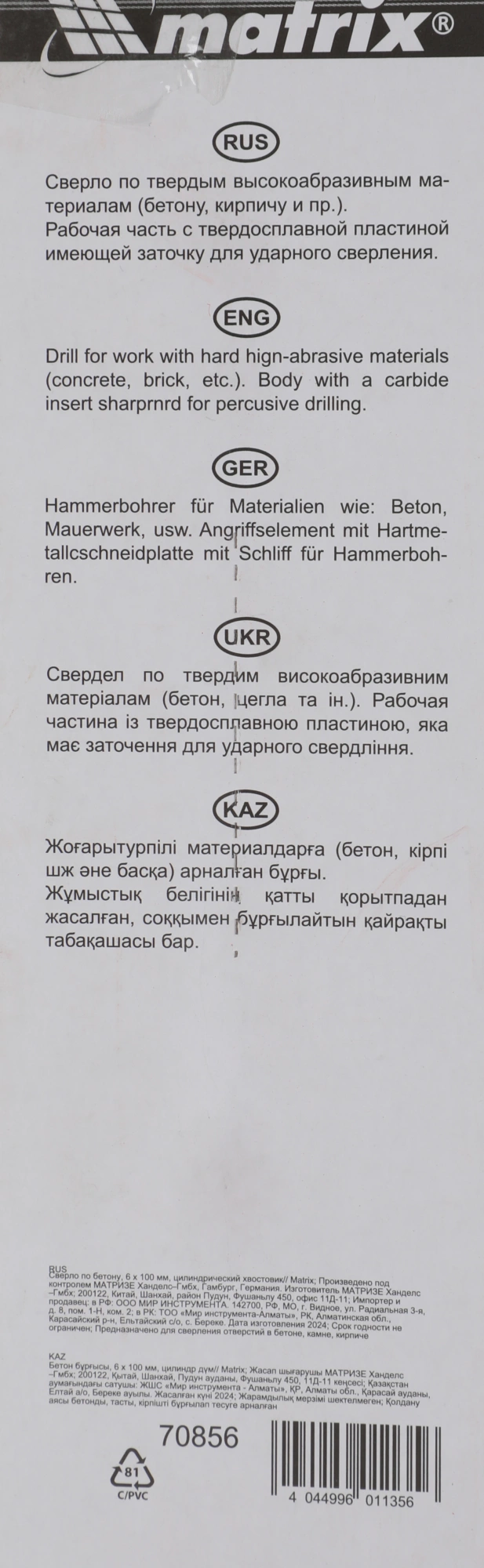Сверло Matrix 70856 по бетону Д=6мм Дл=100мм (1пред.) для дрелей