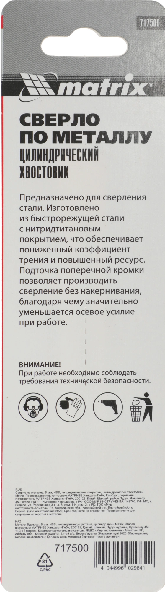 Сверло Matrix 717500 по металлу Д=5мм Дл=86мм (1пред.) для дрелей