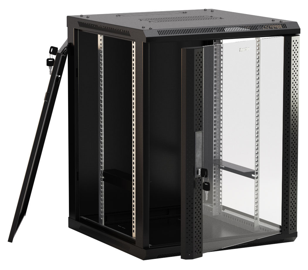 Шкаф коммутационный Hyperline (TWB-FC-2245-GP-RAL9004) настенный 22U 600x450мм пер.дв.стекл 60кг черный 180град. 1098мм IP20 сталь