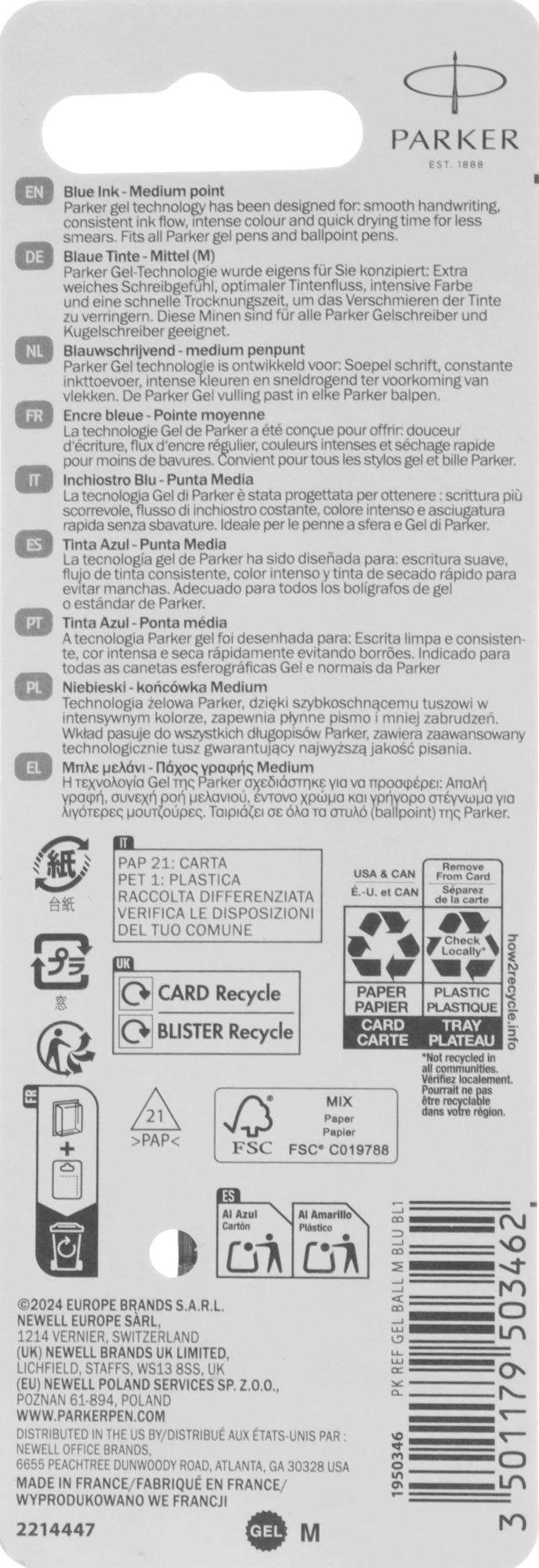 Стержень гелевый Parker Z05 (1950346) M 0.7мм синие чернила для ручек шариковых блистер