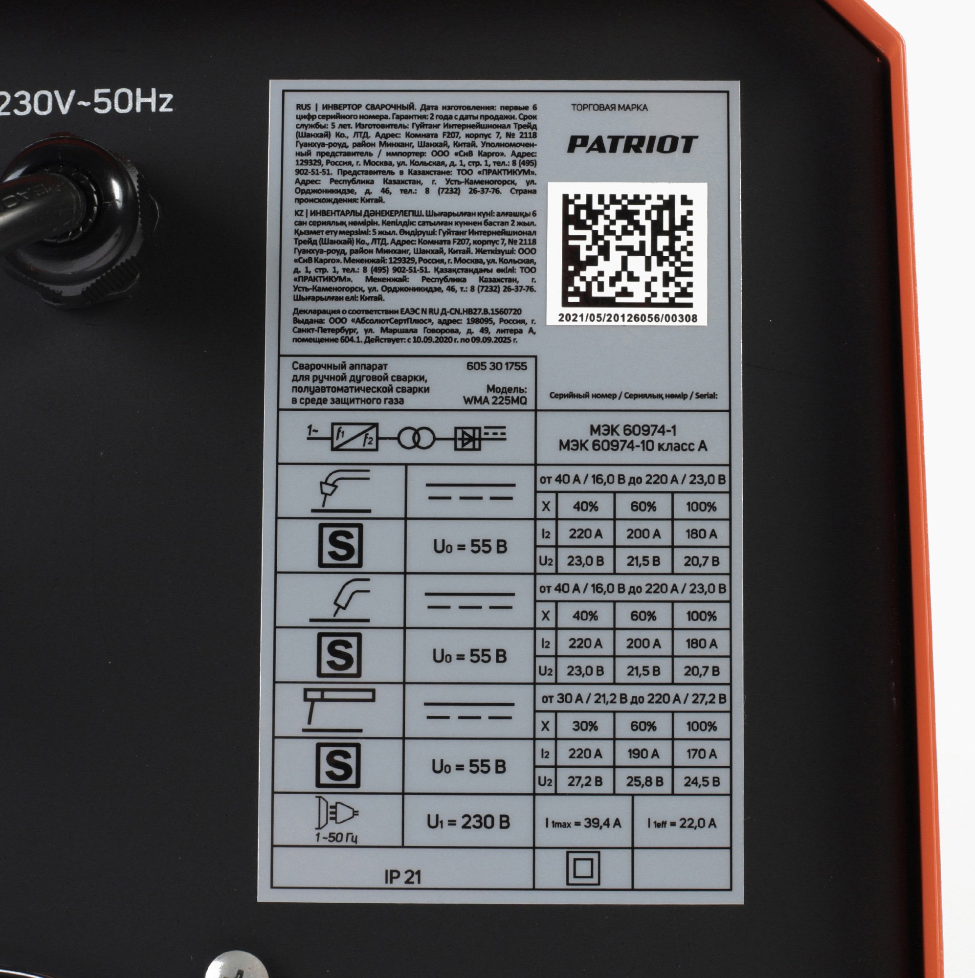Сварочный полуавтомат Patriot WMA 225MQ инвертор MIG-MAG/ММА 9.4кВт